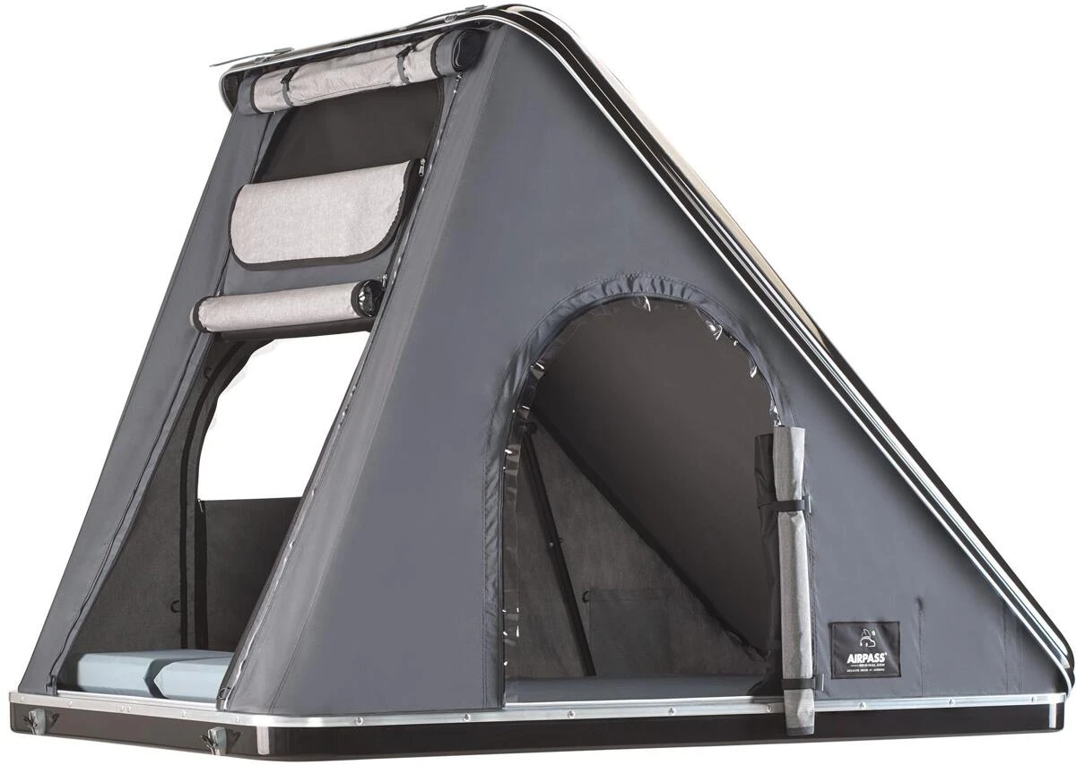 Das AirPass Dachzelt Variant mit serienmässigem Panoramablick. Durch das Keil-Konzept und den Einsatz von zwei Gasfedern ist das AirPass Variant in Rekordzeit aufgebaut. Im geöffneten Zustand offeriert es dann durch die große hintere Öffnung einen einmaligen Panoramablick.