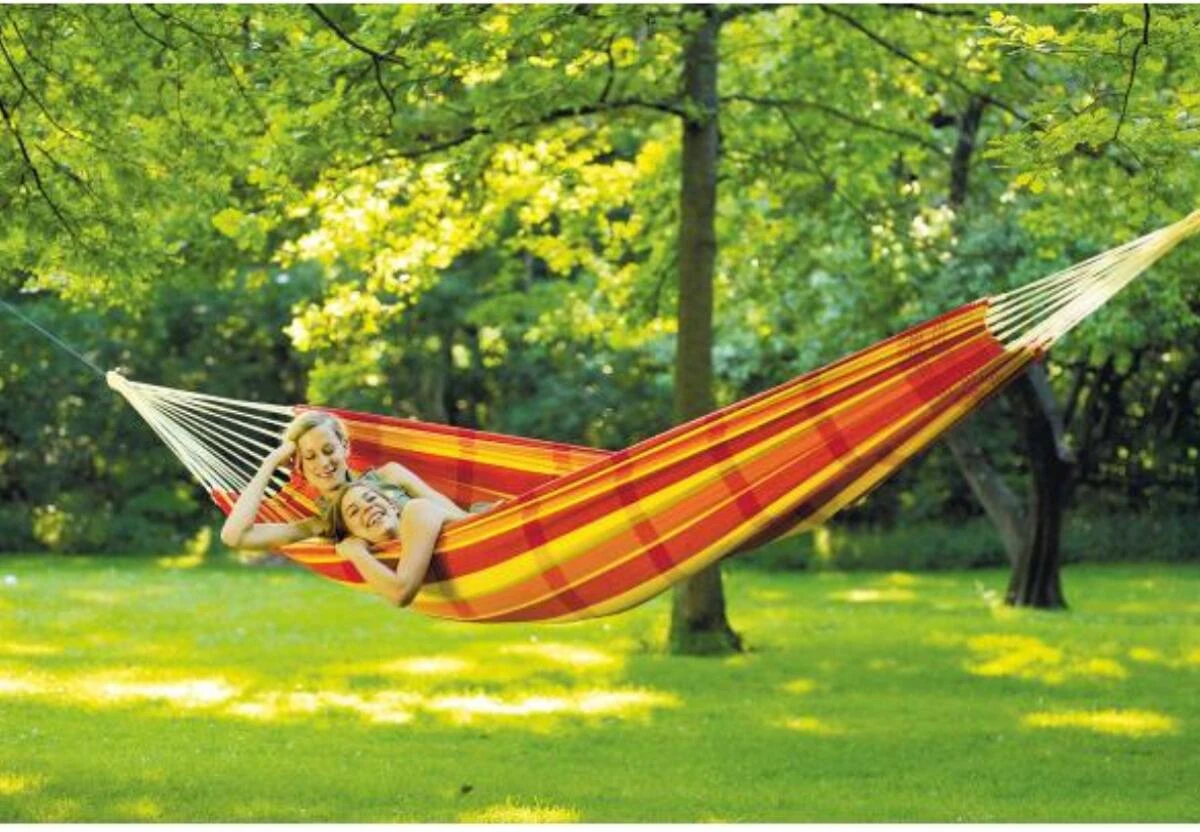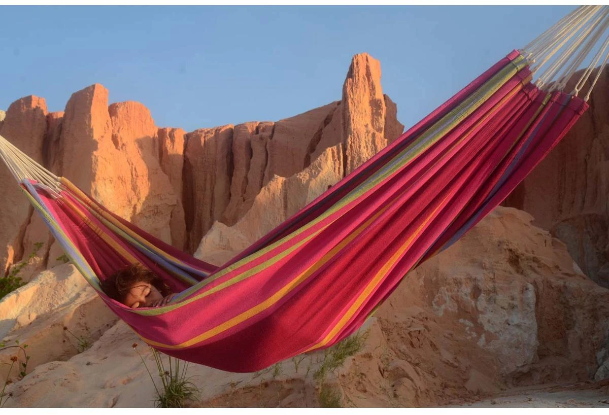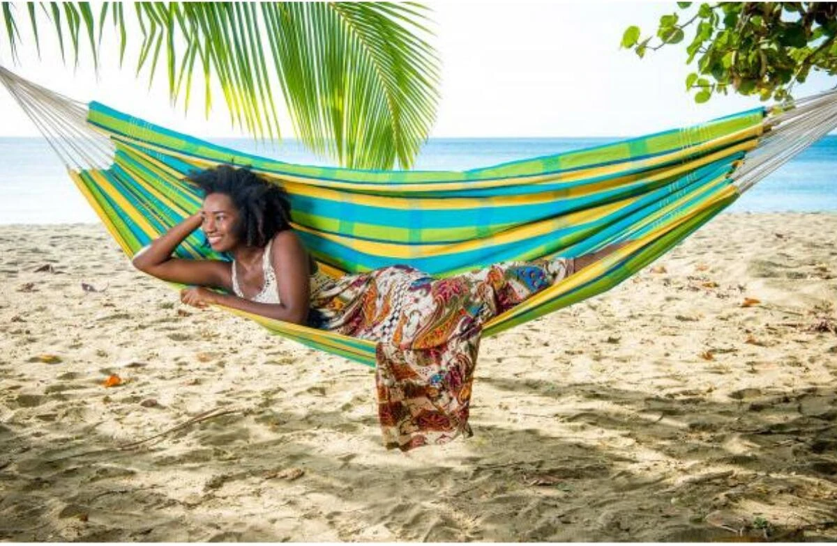 Die XL-Hängematte für das Schaukeln zu zweit oder alleine. In farbenfrohem Design lädt die ‚Barbados‘ zum Entspannen ein. Brasilianische XL-Hängematte für höchsten Hängemattenkomfort. Traditionelle und nachhaltige Handarbeit in Brasilien zu fairen Bedingungen.