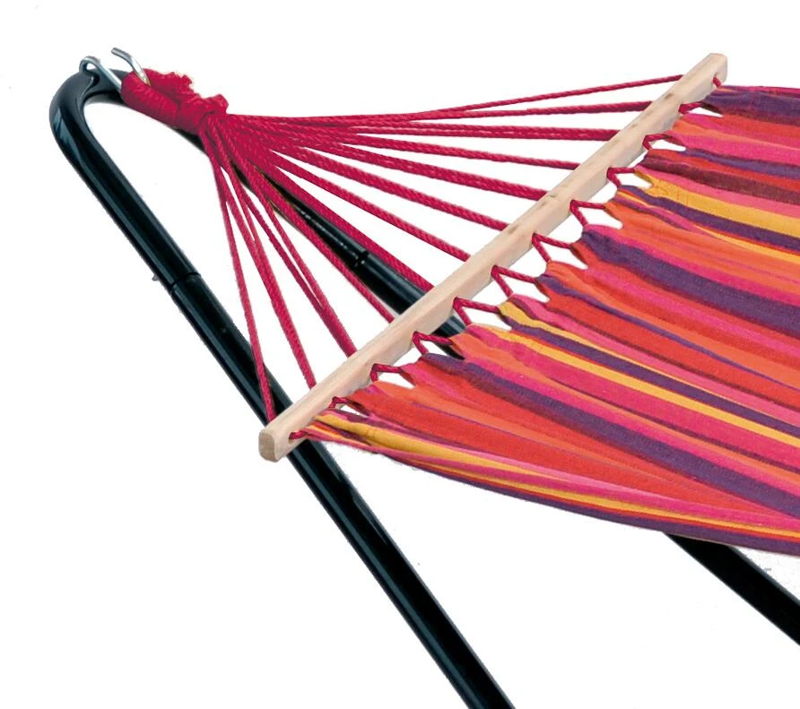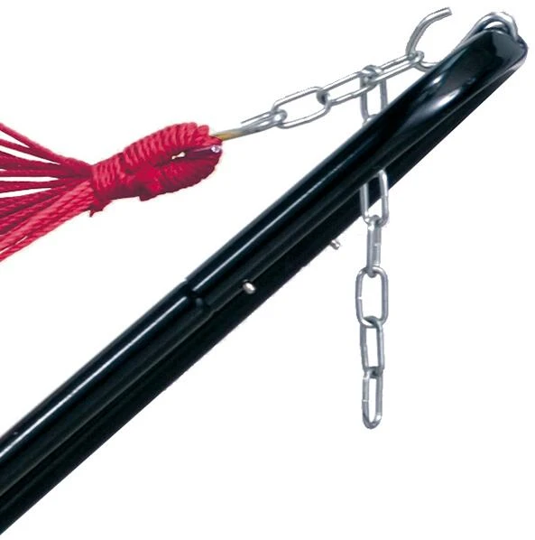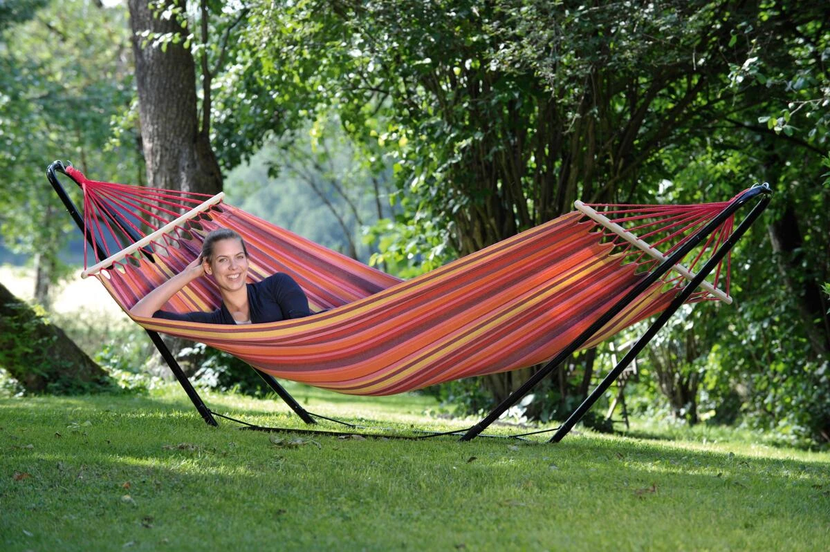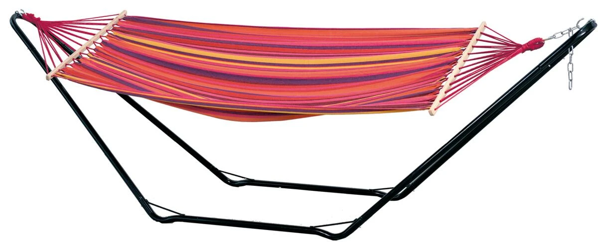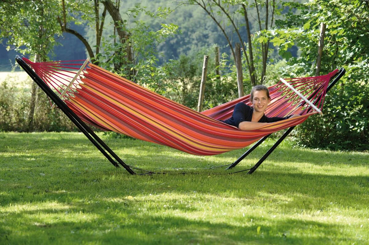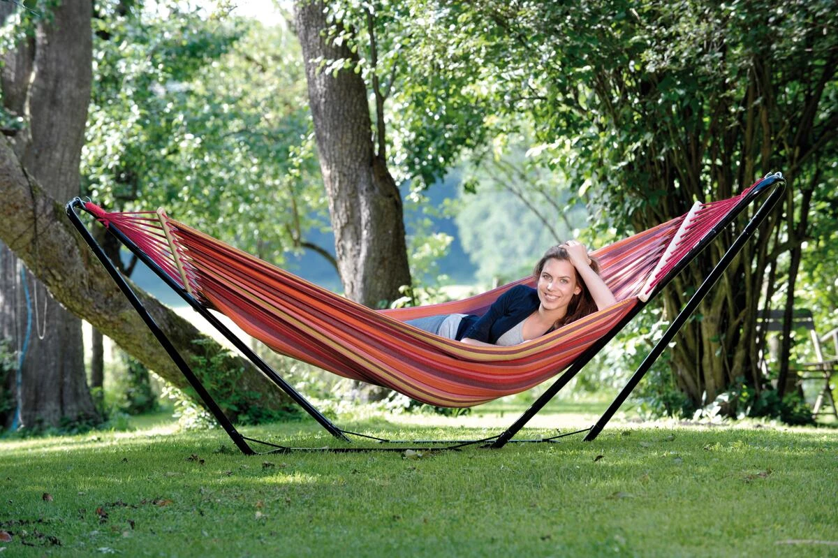 Preiswertes Komplettset mit pulverbeschichtetem Gestell (schwarz) und passender Hängematte im Farbton ‚vulcano‘. Dank der Klickverschlüsse schnell aufzustellen und platzsparend zu verstauen.