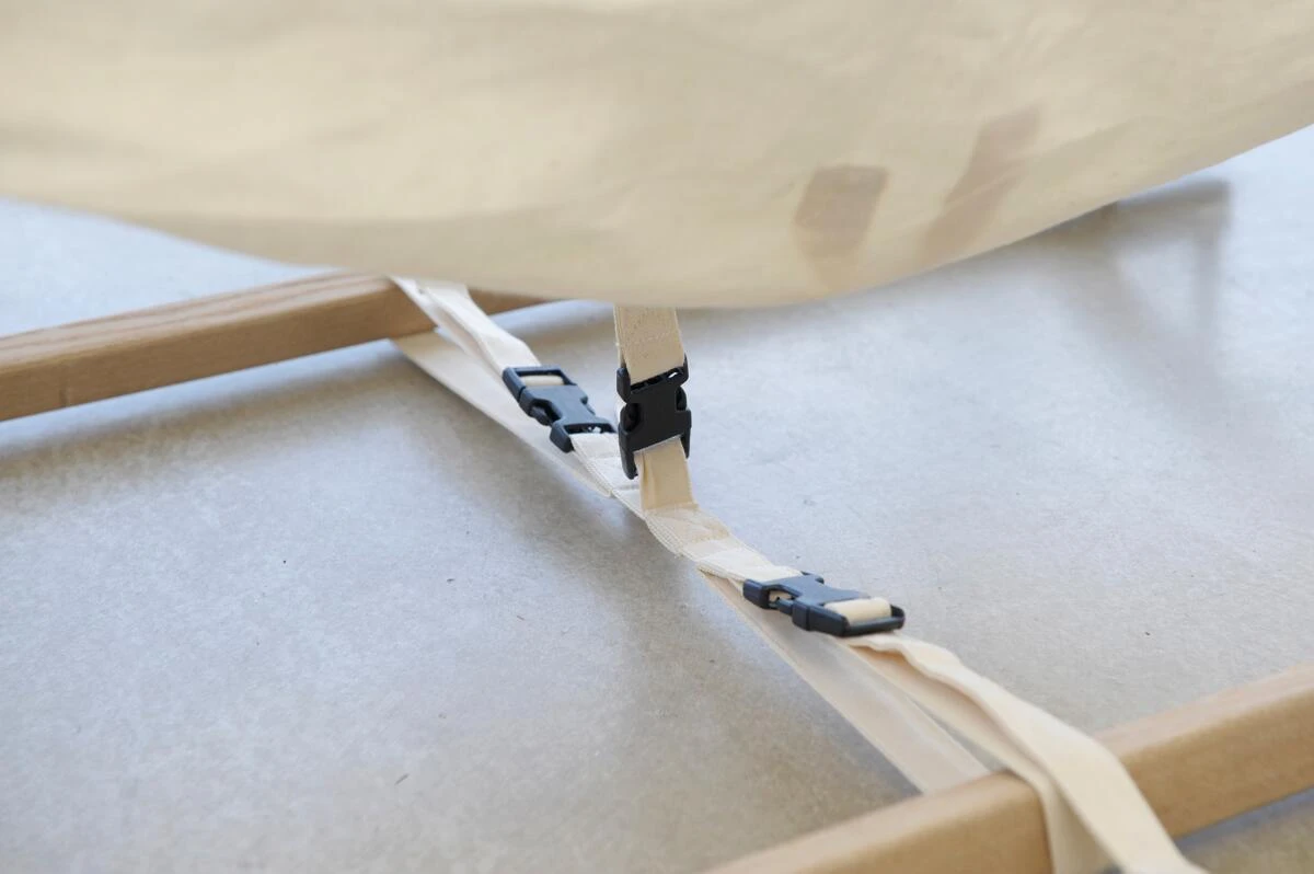 Vor dem Herausfallen schützt ein eingenähtes Sicherheitshöschen mit integrierten Haltegurten. Die Koala ist TÜV-zertifiziert nach der EU Norm EN 1130-1. Diese beinhaltet Tests zur Sicherheit des Produktes, die Einfachheit der Handhabung und die Prüfung auf Schadstoffe. An den Fußstreben, direkt unter der Hängematte, ist ein Schaukelbegrenzer angebracht. Die Hängematte wird dort mit einem Klickverschluss fixiert, damit sie beispielsweise von älteren Geschwisterchen nicht zu stark geschaukelt werden kann. Die Babyhängematte ist kaum grösser als ein zusammengeklappter Sonnenschirm, leicht und handlich. Sie lässt sich schnell einpacken und überall mit hinnehmen.