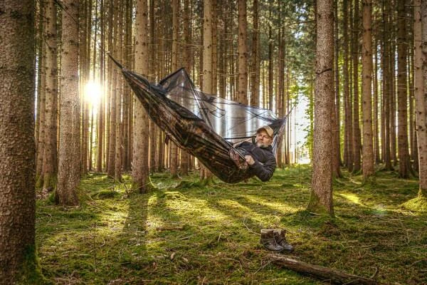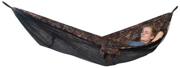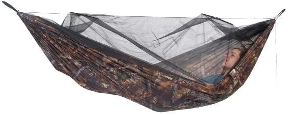 Die Leichthängematte in Tarnoptik mit komfortablem Moskitonetz. Komfortabler Rundumschutz gegen jede Art von Insekten.