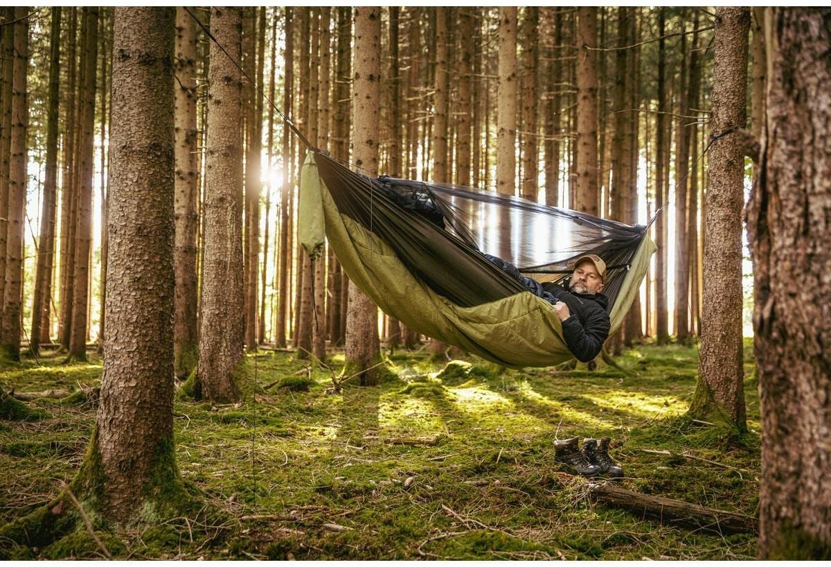 Du liebst es draußen Zeit zu verbringen und auch an kalten Tagen in der Natur in einer Hängematte zu übernachten? Um Dich vor der Kälte von unten zu schützen, blieb Dir bisher nur die Möglichkeit eine extra Isomatte in die Hängematte zu legen oder einen extra Underquilt mitzunehmen. Um extra Gepäck, Gewicht und Zeit beim Aufbau zu sparen, haben wir die Quilted-Hängematte entwickelt. Diese hat unter der diagonal verlaufenden Liegefläche eine eingebaute Wärmedämmung aus wärmender Hohlfaserfüllung. Damit schläfst Du auch an kälteren Tagen warm und sicher in Deiner Outdoor-Hängematte. Die Wärmeisolierung funktioniert wie ein eingebauter Underquilt und ist so angebracht, dass dieser bei Benutzung der Hängematte nicht zu stark an die Liegefläche gepresst wird – das verspricht ein zusätzlich isolierendes Luftpolster zwischen Hängematte und Wärmedämmung.