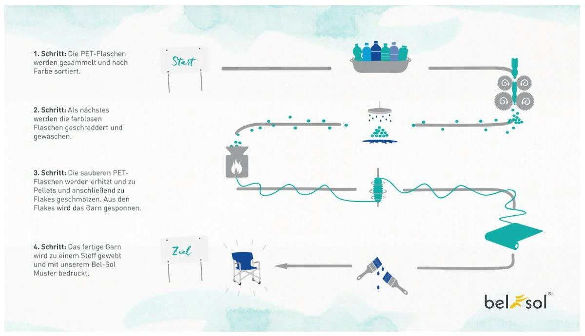 Da Nachhaltigkeit auch beim Campen eine große Rolle spielen sollte, setzt Bel Sol auf Produkte aus recyceltem PET. So landen die PET-Flaschen nicht mehr im Meer oder an verschmutzten Stränden, sondern werden zu Stoffen verarbeitet. Der Stoff des Küchenmoduls besteht aus 128 PET-Flaschen.