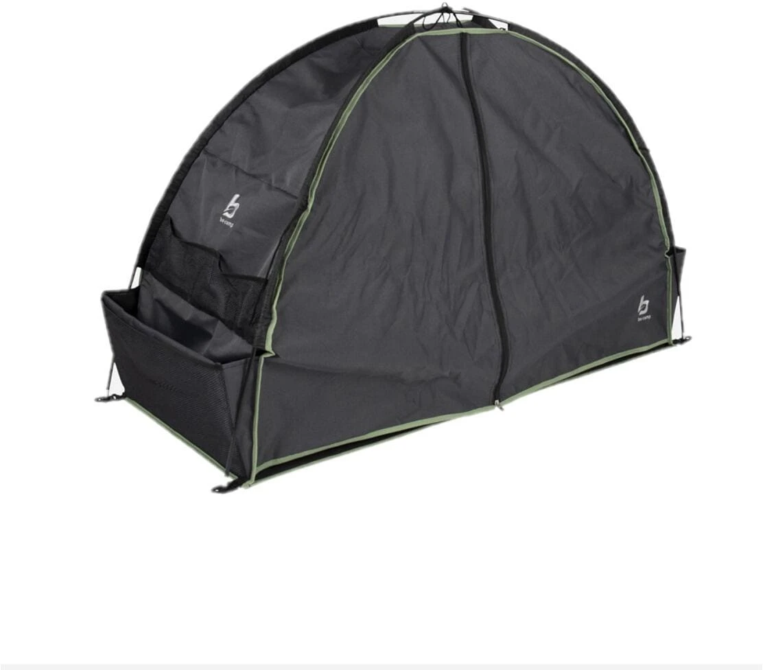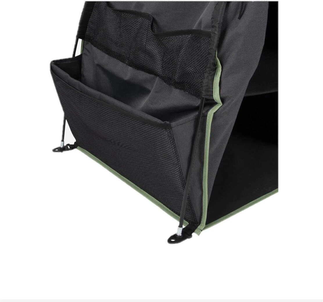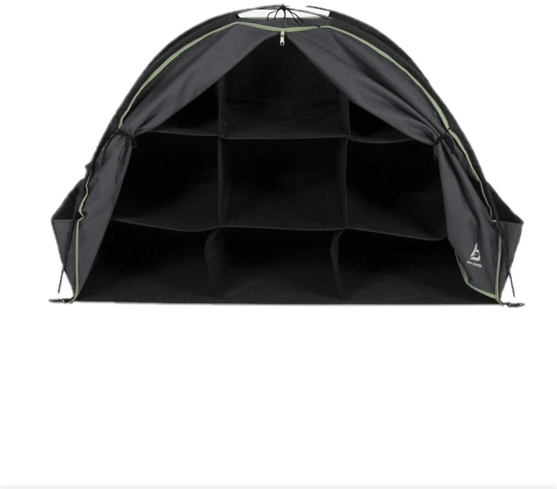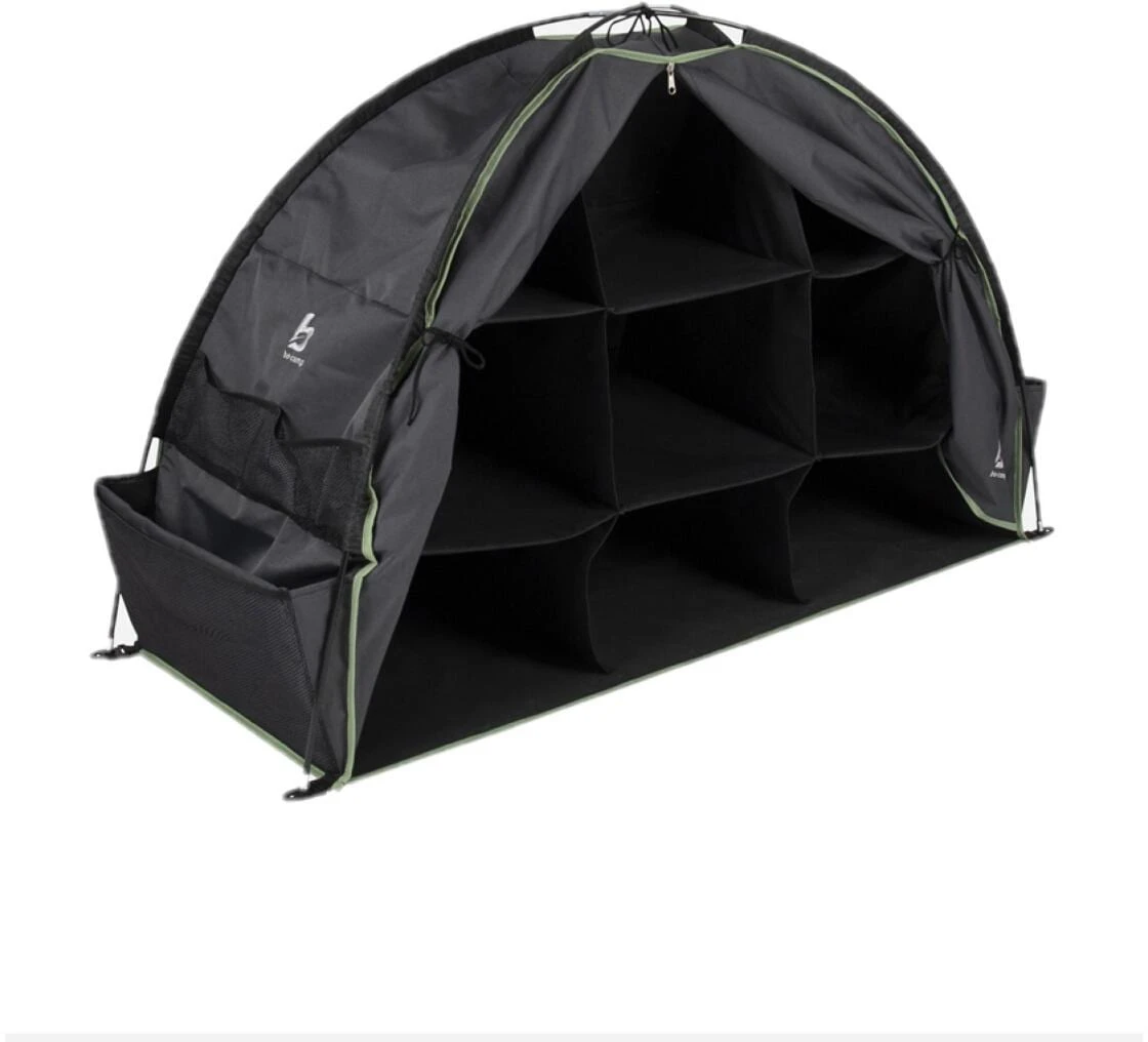 Der Bo-Camp Schrank ist multifunktional und ausgestattet mit 9 Fächern, 3 Seitennetzen und 2 Seitentaschen für ausreichend Stauraum.