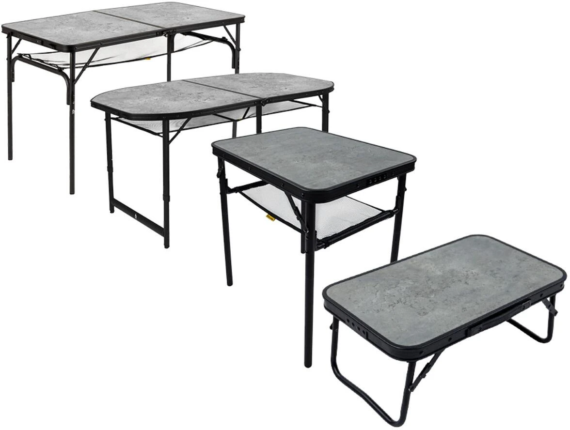 Ein stilvoller Aluminiumtisch im angesagten Industrielook mit Tischplatte in Betonoptik, erhältlich in verschiedenen Ausführungen. Alle Tische sind klappbar, leicht zu verstauen und Dank Griff einfach zu transportieren. Außerdem verfügt der Tisch über ein praktisches Netz um Kleinutensilien aufzubewahren.