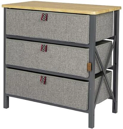 Ein stilvoller Camping-Schrank mit 3 Schubladen. Der Schrank hat einen Holzrahmen, eine MDF-Platte und drei Schubladen aus Oxford-Polyester mit Leinenoptik. Er ist sehr einfach zusammenzulegen und in der mitgelieferten Tragetasche leicht zu transportieren