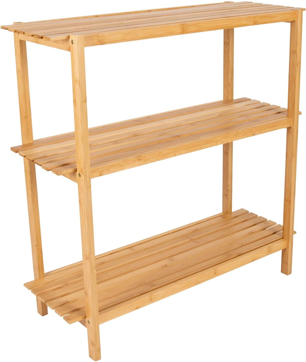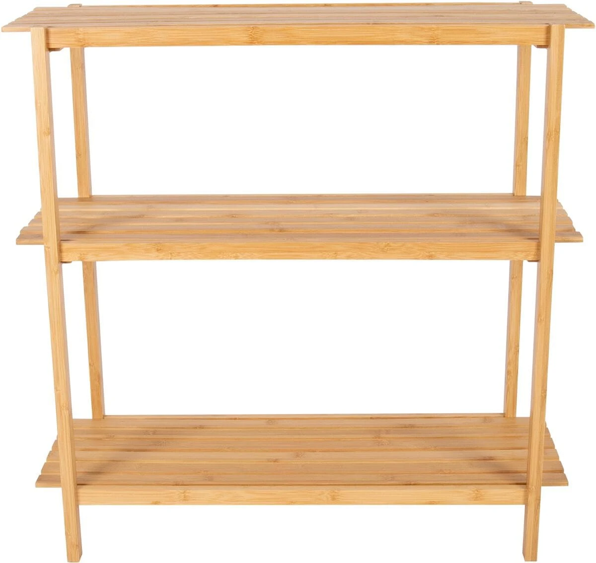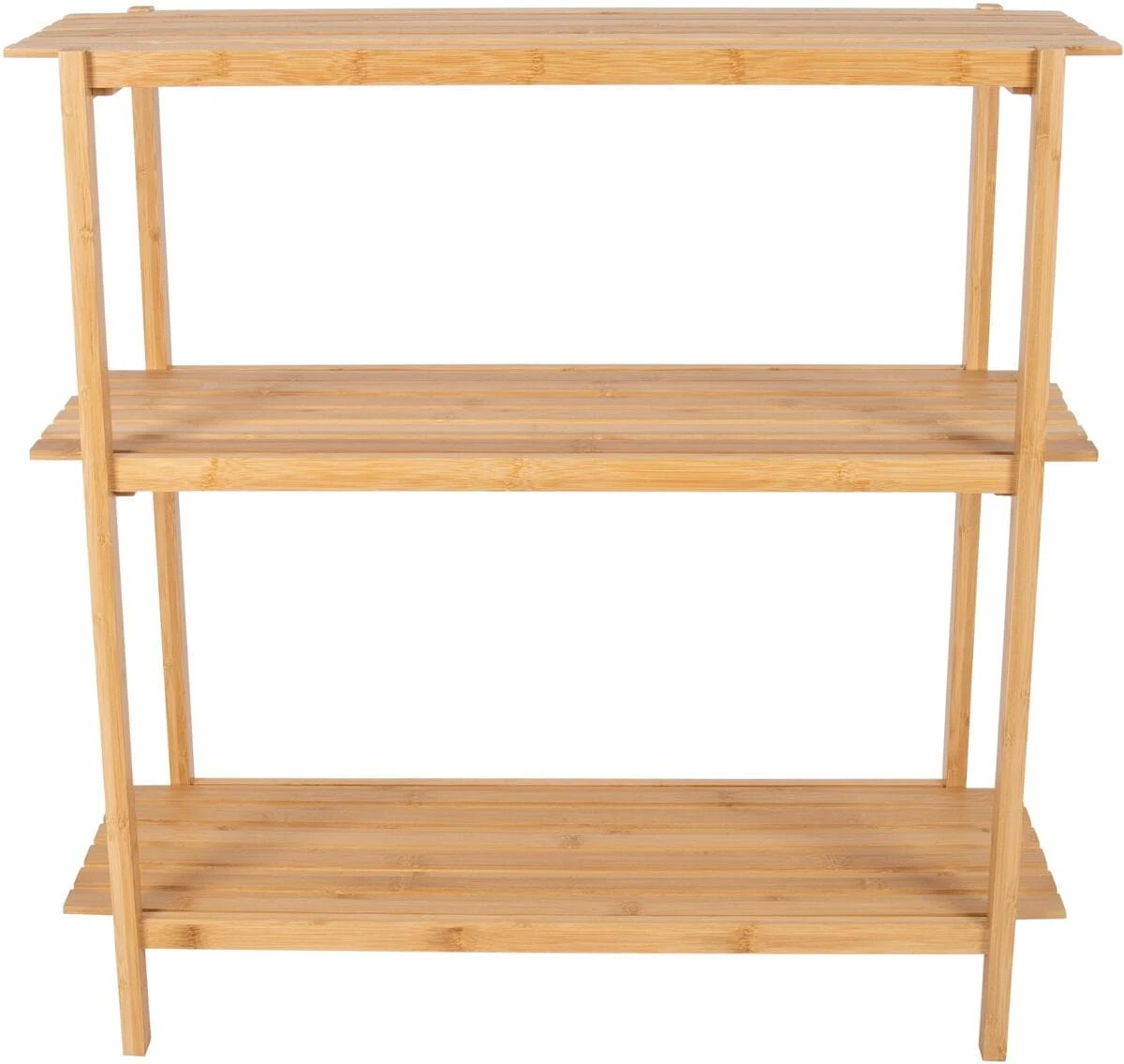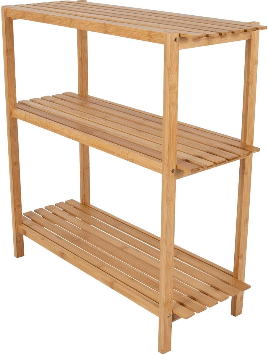 Ein stilvolles Regal mit 3 Ablageflächen. Das Regal ist aus stabilem Bambus. So sind die Gegenstände leicht zu verstauen. Ideal für im Zelt, auf dem Balkon, oder auch in der Wohnung, zum Beispiel im Bad.