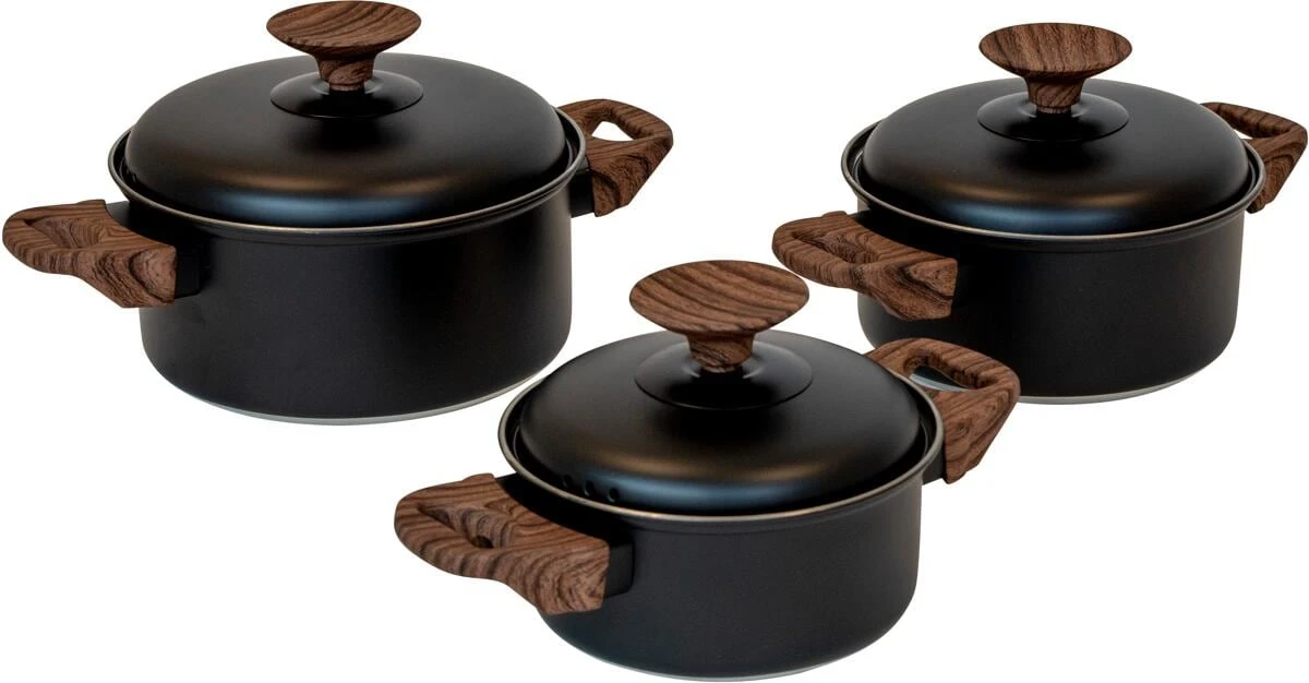 Ein 3-teiliges Topfset aus rostfreiem Stahl. Jeder Topf hat einen Glasdeckel mit hitzebeständigem Knauf. Die Töpfe haben einen industriellen Look durch das schwarze Edelstahl und die Knöpfe in Holzoptik. Darüber hinaus hat jeder Topf hitzebeständige Griffe. Diese Griffe lassen sich nach dem Gebrauch einfach einklappen, so dass die Töpfe vollständig und kompakt zu lagern sind. Sparen Sie bis zu 40% Platz! Die Töpfe sind schmal aber dafür hoch und somit äußerst gut geeignet für den begrenzten Platz auf Gasbrennern. Kann auf Gas-, Keramik- und Elektroherden verwendet werden.
