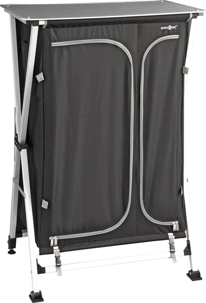 Großer Camping-Multifunktionsschrank mit 2 getrennten RV-Fächern mit insgesamt 6 innenliegenden Ablagen. Das etwas schmälere Fach kann zudem dank mittig teilbarer Ablagen und einer eingebauten Hängestange zum Kleiderschrank für Jacken und Hosen umgebaut werden. Sehr stabile Ausführung mit Alu-Kreuzgestell und verwindungssteifen Rechteckprofilen. Vorder- und Hinterwand können durch eine spezielle Spannvorrichtung zusätzlich gespannt und stabilisiert werden. Breite, schwenkbare Fußplatten verhindern das Einsinken des Schranks auf weichen Böden oder verhindern mögliche Beschädigungen an Zeltboden oder -teppich. Ein höhenverstellbarer Fuß erlaubt einen perfekten Niveauausgleich bei Bodenunebenheiten. Ein Gazefenster in der Rückwand sorgt für die Innenbelüftung des Schrankes.