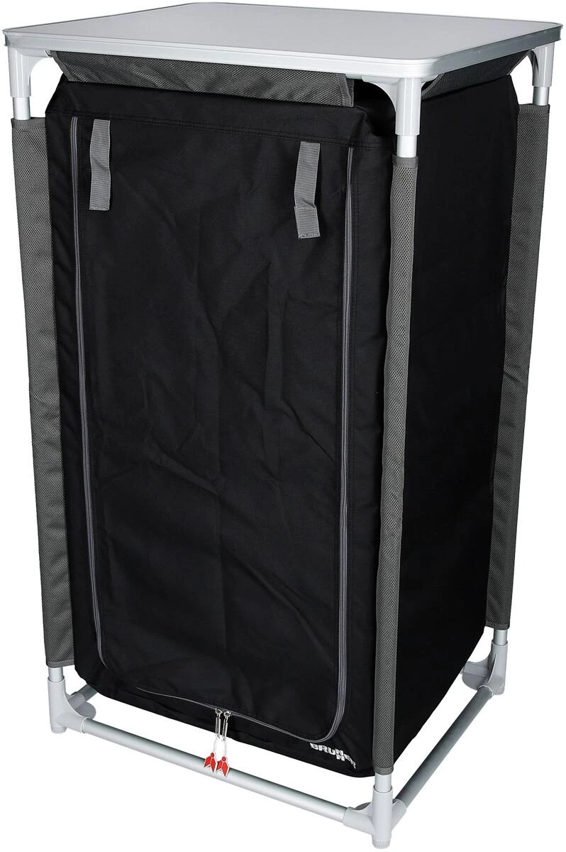 Ein zum Teil vormontiertes Rahmengestänge, auf das ein hochwertiger Bezug aus widerstandsfähigem, recyclebarem Polyester aufgezogen wird, bildet das Gerüst für die in Anthrazit gehaltenen Schränke. Die abriebfesten, aus Ripstop Nylon gefertigten Gestängekanäle des Bezugs, in dem rückseitig in Lüftungsgaze eingearbeitet ist, sorgen für schnellen Auf- und Abbau, die Ablageböden werden einfach einglegt. Den oberen Abschluss der stabilen Konstruktion bildet eine Ablageplatte.