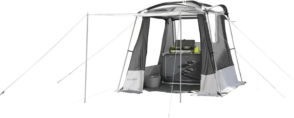 Vielfach einsetzbares Küchen- und Materialzelt mit stabilem Stahl-/Fiberglasgerüst, grossen Fenstern und einer hochrollbaren Eingangstür. Mit Rundum Erdstreifen. Inkl. Montagematerial und Packsack.