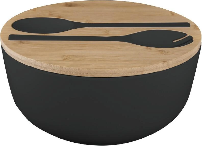 Mit diesem praktischen Set können Sie auch im Campingurlaub leckeren Salat zubereiten und genießen. Das Besteck lässt sich besonders platzsparend im Deckel verstauen.