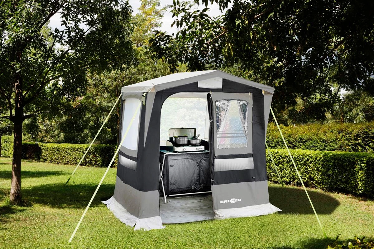 Klassisches Küchenzelt mit Giebeldach. Alle Fenster sind mit Moskitogaze und Folienabdeckung ausgestattet. Dach und Erdstreifen sind aus beidseitig beschichtetem PVC gefertigt