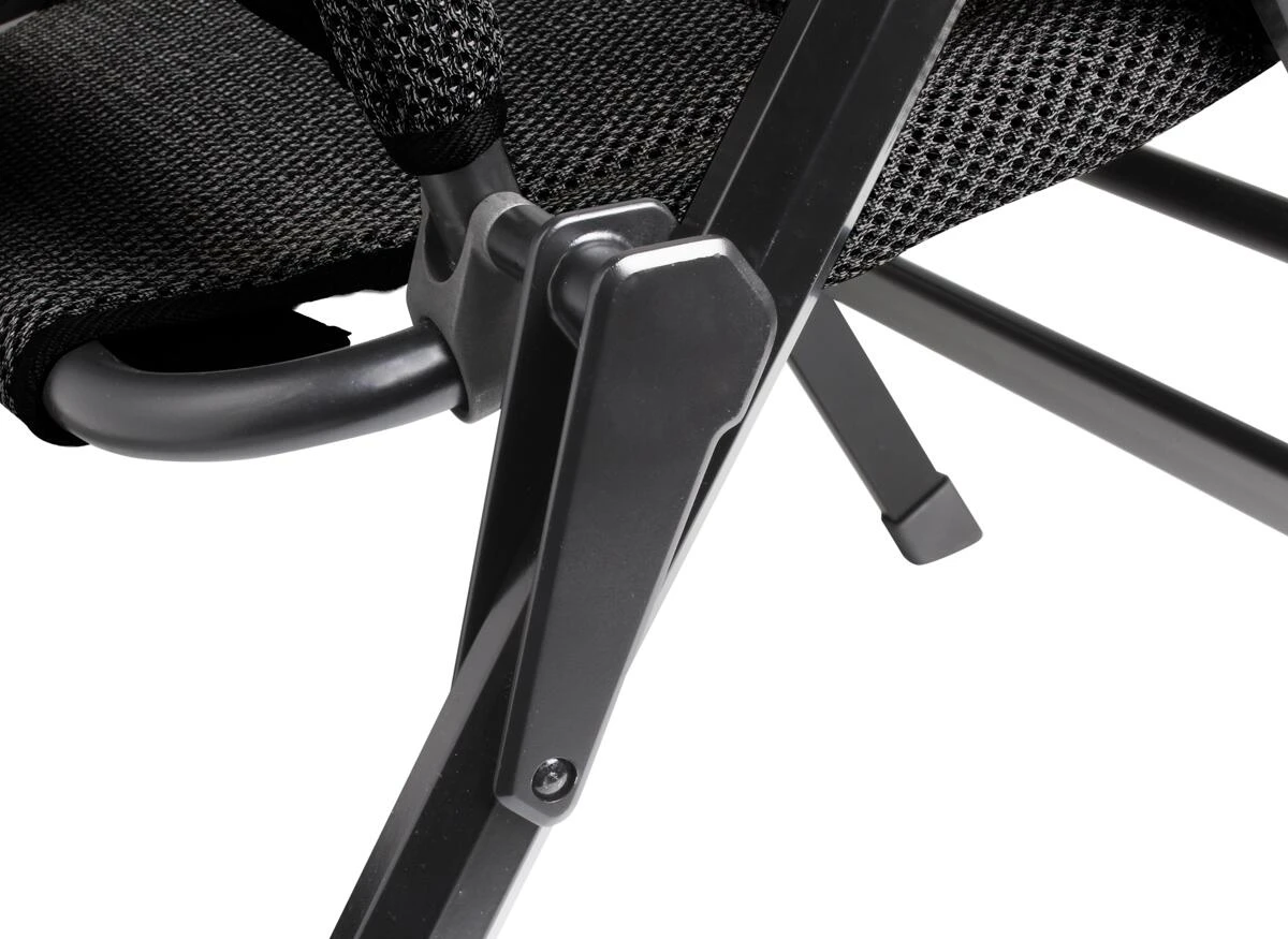 Moderner und platzsparender Campingstuhl mit pulverlackiertem Alu-Gestell, metallverstärkten Armlehnen zur 5-fachen Verstellung der Rückenlehnen und atmungsaktivem Full-3D Bezug.