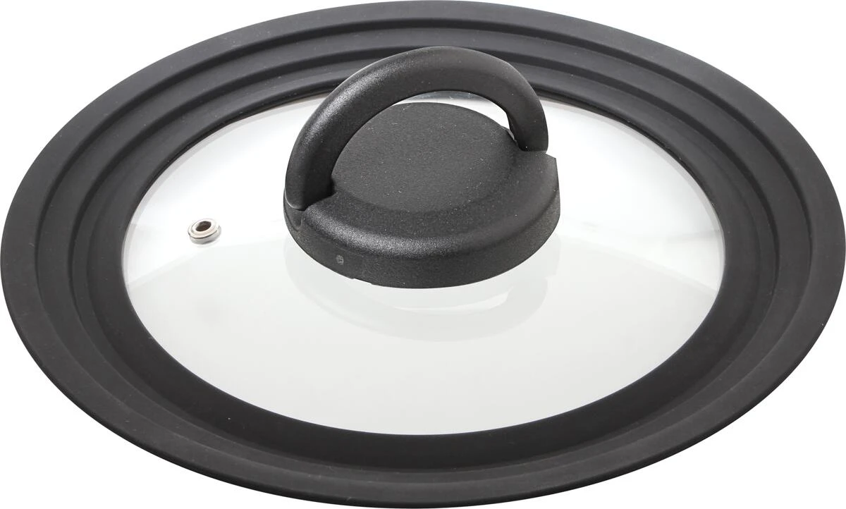 Universal Glasdeckel mit abgestuftem Silikonrand, passend für Töpfe und Pfannen mit verschiedenen Durchmessern.