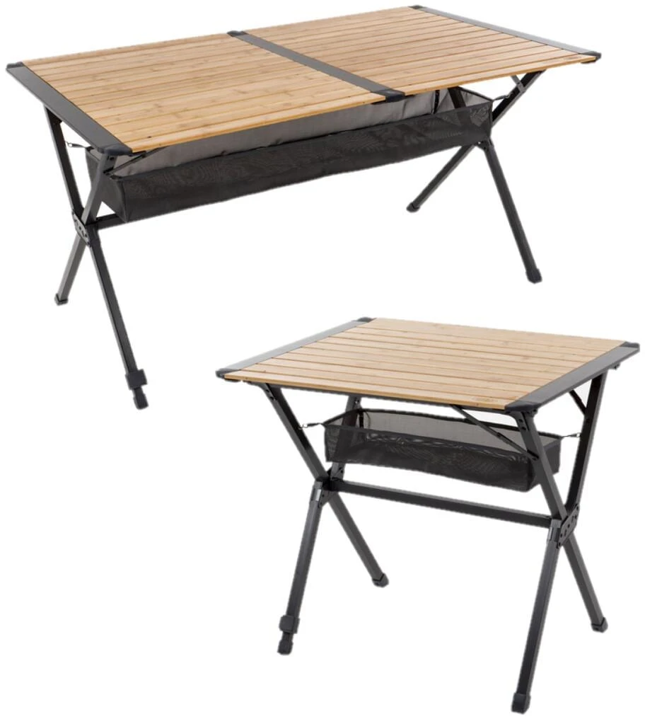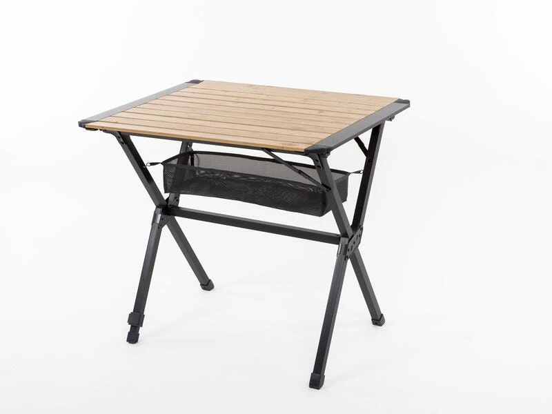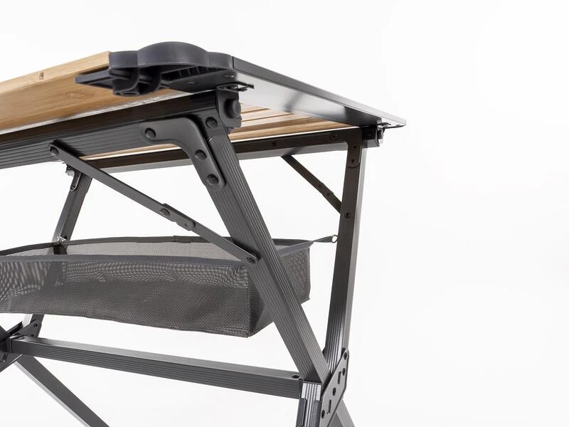 Rolltisch Mendoza mit Bambus Tischplatte und robustem Aluminiumgestell. Mit Niveauregulierung. Dank des kleinen Packmaßes eignet sich dieser Tisch besonders für Camping und Reisen im Camper oder im Van.
