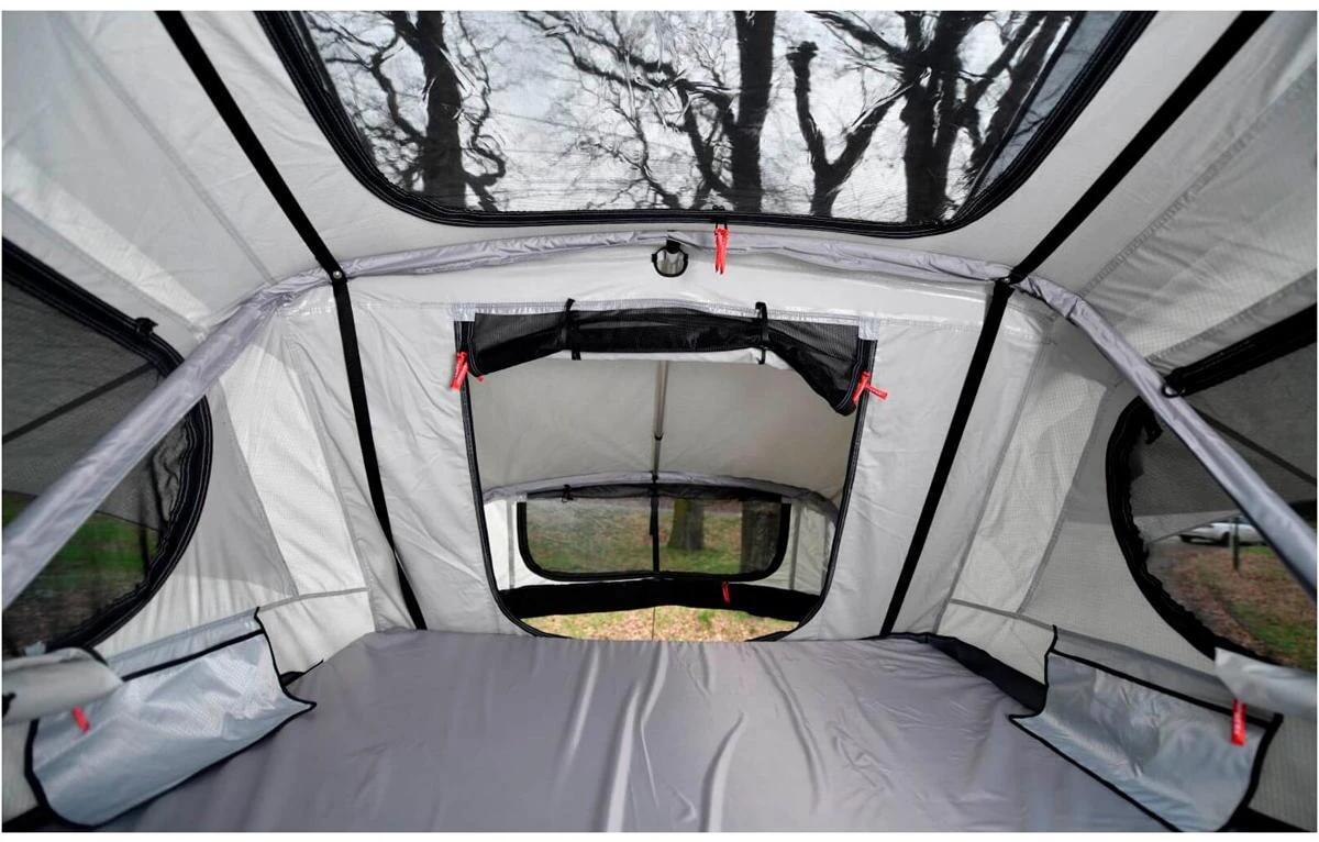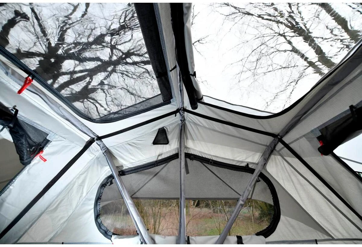 Entfernt man die Abdeckplane indem man die Klettverschlüsse und den Reißverschluss öffnet, lässt sich das Dachzelt mit wenigen Handgriffen mittels der integrierten Teleskopleiter entfalten. Über diese Leiter aus robustem Aluminium gelangt man in den großzügigen Schlafraum. Dort kann man es sich gleich auf der hochwertigen und bequemen Kaltschaummatratze bequem machen. Als Matratzenunterlage wurde ein zusätzliches PVC-Membran eingebaut um sie vor Feuchtigkeit zu schützen. Ein ganz besonderes Highlight bieten die zwei Panorama Dachfenster, durch denen man abends besonders schön in den Sternenhimmel schauen kann. Außerdem verfügt das Adventure Dachzelt über rundherum große Fenster, alle versehen mit einem sehr feinen Moskitonetz, einem von innen verschließbaren Wetterschutz sowie speziellen Überdachungen, die das Durchlüften auch bei starkem Regen ermöglichen. Das mitgelieferte Tropendach welches man ganz einfach abnehmen kann, z.B. um es zu Reinigen, sorgt für das perfekte Klima im Zelt, auch in besonders warmen Regionen. Die Luftschicht zwischen Wohnkabine und Tropendach verringert die Hitzeentwicklung im Zelt.