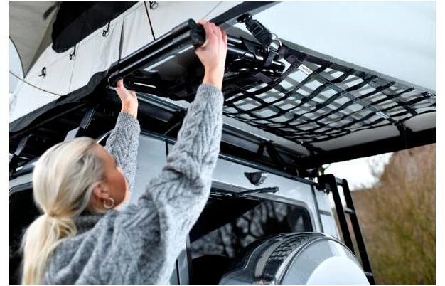 Auch an Stauraum wurde bei dem Adventure Dachzelt nicht gespart. Damit nichts verloren geht sind große Taschen im Innenraum eingenäht, für Handy, Brillenetui und Co. An Haken mangelt es bei dem Adventure Dachzelt ebenfalls nicht, denn Haken kann man nicht genug haben. Ob für die LED Zeltlampe oder um einfach nur die Mütze aufzuhängen. Um noch eins drauf zu setzen, gibt es inklusive zu dem Adventure Dachzelt ein speziell entwickeltes Staunetz. Inspiriert von Ladungssicherungen bei Flugzeugen sorgt dieses robuste und extra stabile Gepäcknetz unter dem Zeltboden für zusätzlichen Stauraum. Geht die Reise weiter, kann das Dachzelt ganz unkompliziert wieder zusammengeklappt werden und man hat immernoch genug Platz um die Bettwäsche einfach im Zelt liegen zu lassen.