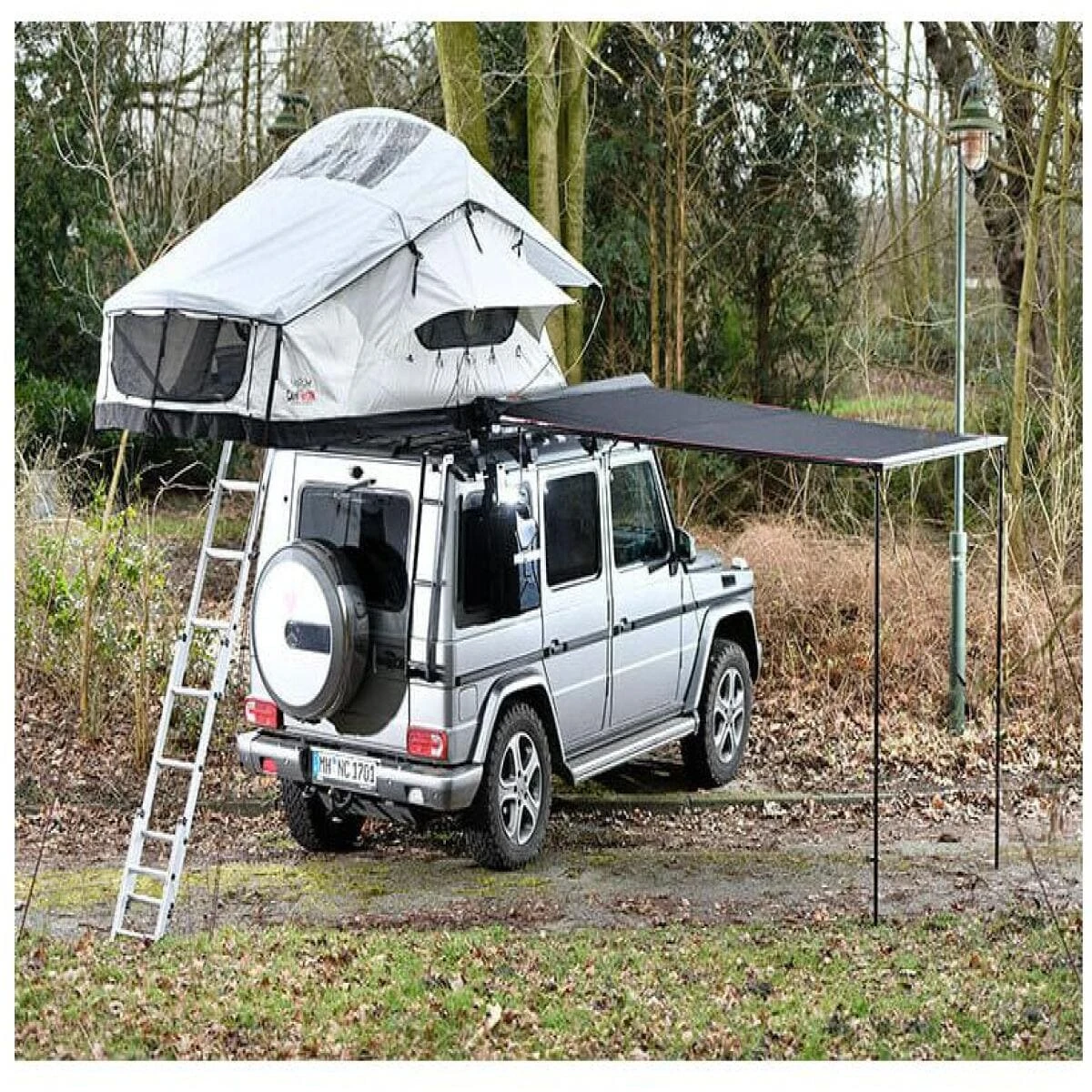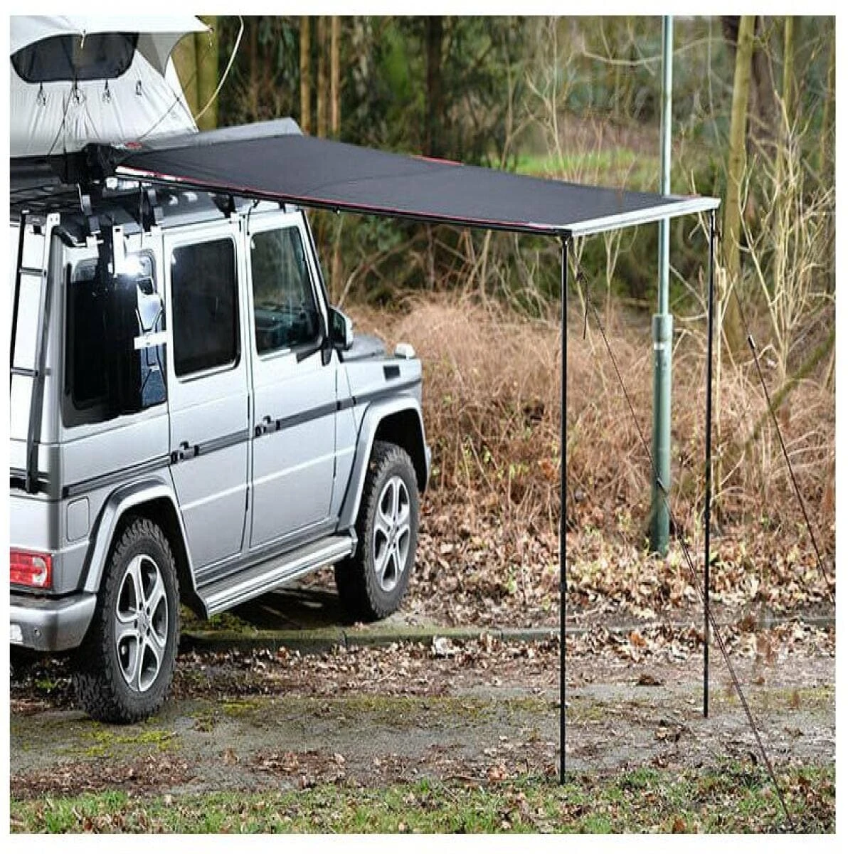 Mit der Markise für dein Auto schaffst du dir an heißen Tagen einen kühlen Schattenplatz und wenn es regnet, einen trockenen Unterstand, unter dem der Regen nicht mehr ist als ein leises Geräusch auf dem Markisendach. Die Markise wird am Fahrzeug (Dachträger/Reling) montiert und lässt sich leicht ein- und ausrollen. Wird sie nicht gebraucht, kanns sie in der wasserdichten und schmutzabweisenden Schutzhülle verstaut werden, welche sich mit einem Reißverschluss öffnen und schließen lässt. Die Markise kann mithilfe von eingenähten Klettverschlüssen mit dem Seitengestänge verbunden werden, sodass sie auch an windigen Tagen kaum flattert.