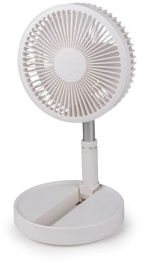 Dieser vielseitige Ventilator punktet mit seinem kompakten Packmaß. Das kabellose Gerät wird mit einem Akku betrieben und anhand des mitgelieferten USB-Kabels geladen.