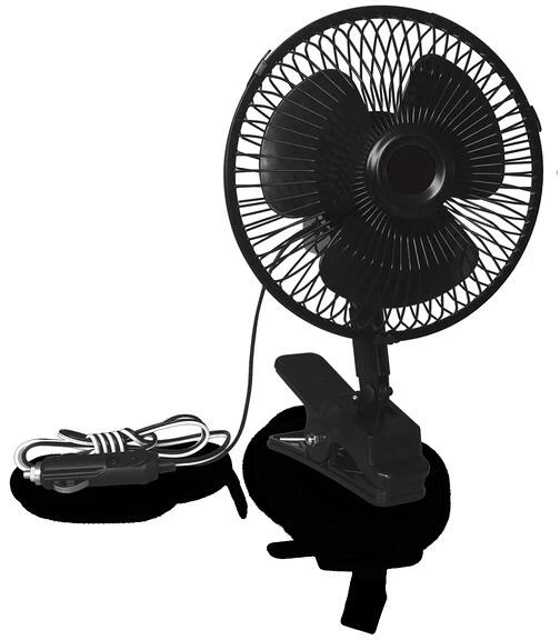 Ventilator mit Klammerbefestigung, Kabellänge 1,5 Meter, Material PP und Metall. Durch den Clip ist der Ventilator problemlos anzubringen und zu entfernen. Mit 12V – Zigarettenadapter. Ø18cm