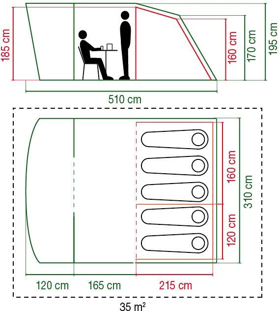 - Außenzelt: Polyester, PU überzogen, feuerhemmend