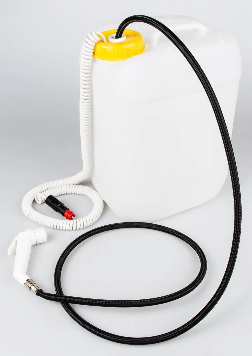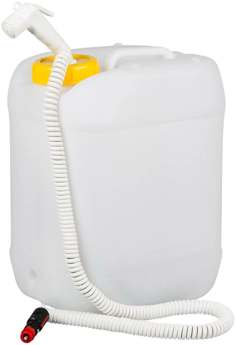 Als Reisedusche unentbehrlich für Camping, Freizeit, Sport und Beruf. Einfachste Handhabung – Stecker in 12 V-Steckdose stecken, Schlauch aus dem Kanister ziehen, Hebel vom Brause-Handstück betätigenund schon fließt Wasser. Ob Sie sich bei einer Reparatur die Hände schmutzig gemacht haben, ob Sie Ihren Hund nach dem Spaziergang abduschen wollen, ob Sie sich auf dem Campingplatz duschen wollen, einfach überall da, wo eine 12 V-Steckdose vorhanden ist, kann jetzt Wasser fließen.