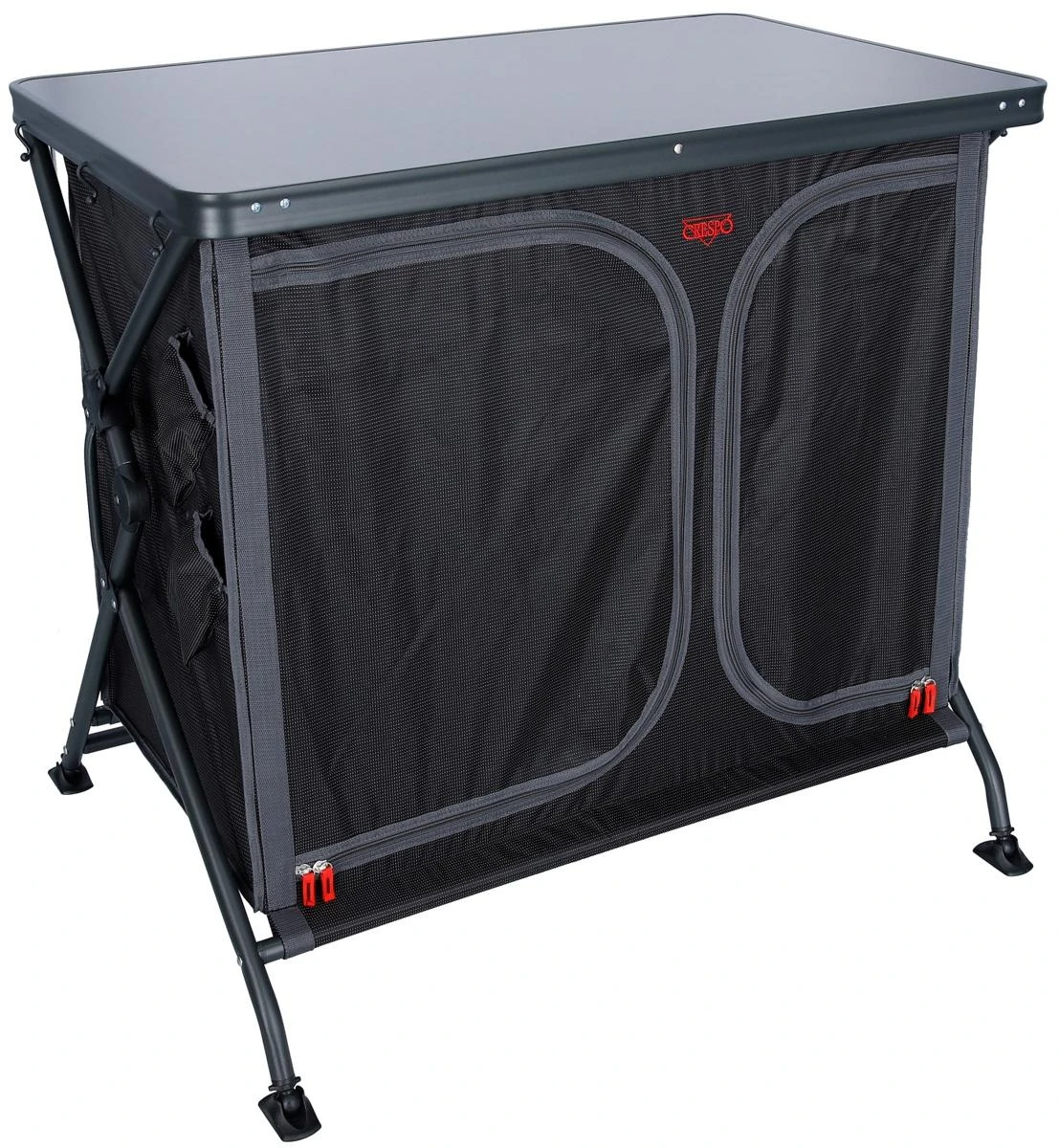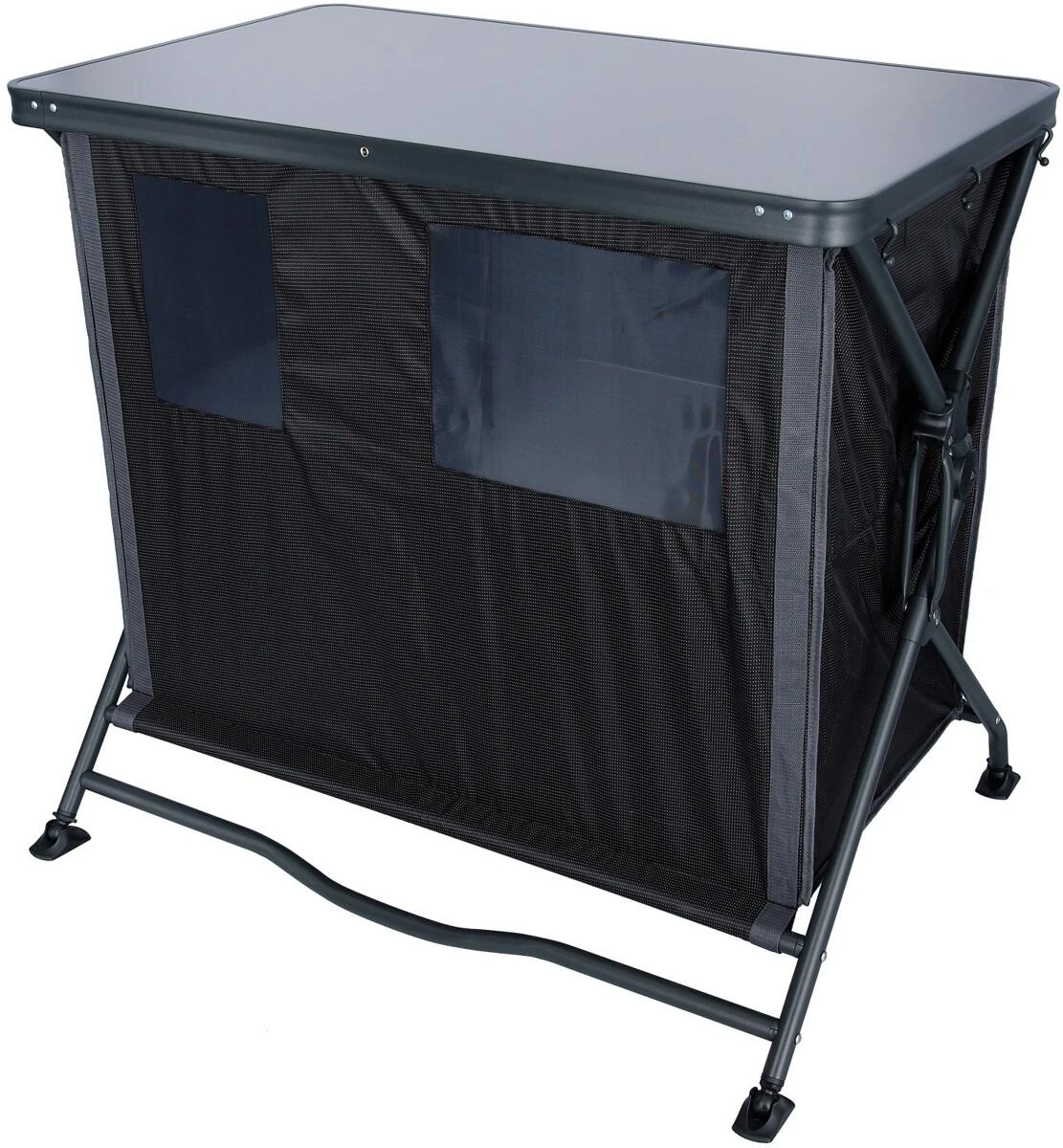 Sehr leichter faltbarer Aluminium-Faltschrank. Ultraschneller Aufbau in 30 Sekunden. Aluminiumgestell mit anthrazitfarbener Epoxy-Beschichtung. Abnehmbare obere Ablageplatte, die eine zusätzliche Fläche bietet. Mit seitlichen Utensilientaschen, vier Einlegeböden, Moskitogaze und Vorhängeschloss am Reißverschluss. Höhenverstellbare, selbstnivellierende Stabilisierungsfüße zur Vermeidung von Wackeln auf unebenen Böden. Lieferung erfolgt inkl. einer praktischen, strapazierfähigen Trage- und Aufbewahrungstasche.