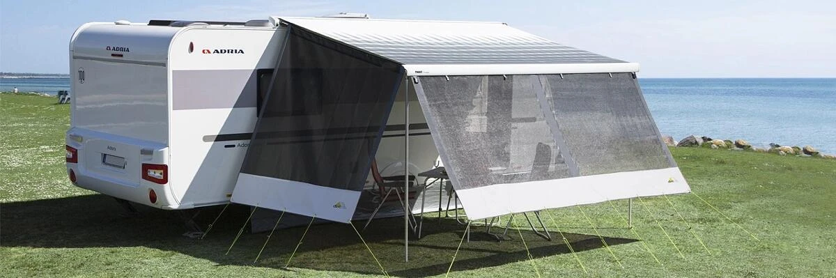 Happy Sun Markisenwandteile bestehen aus robustem Mesh-Gewebe. Dabei handelt es sich um ein PVC-beschichtetes Polyester-Gittergewebe, das extrem reißfest und abwaschbar ist. Für den Spritzschutz wird beidseitig PVC-beschichtetes Polyestergewebe verwendet, das für optimale Hygiene ebenfalls abwaschbar ist. Alle Abspannösen sind hochfrequenz-verschweißt und außerordentlich belastbar.