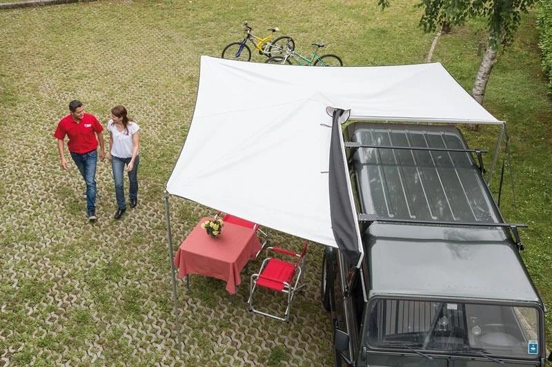 Die leichte Markise, die sich um das Fahrzeug schmiegt und auf 270° Schutz vorm Schatten bietet