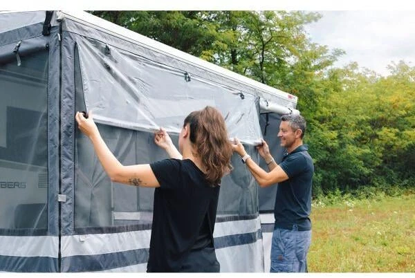 Die kompakte und leichte Privacy Lösung für die Caravanstore und F35 Pro Markise. Einfache und schnelle Anbringung. Die Seitenfenster, welche geöffnet werden können, sind mit Moskitonetzen versehen. Das Vorderteil mit aufrollbarem Fenster und Moskitonetz wird einfach in die Kederschiene der Rolle eingezogen und mittels Reißverschlüssen ganz einfach mit den Seitenteilen verbunden.