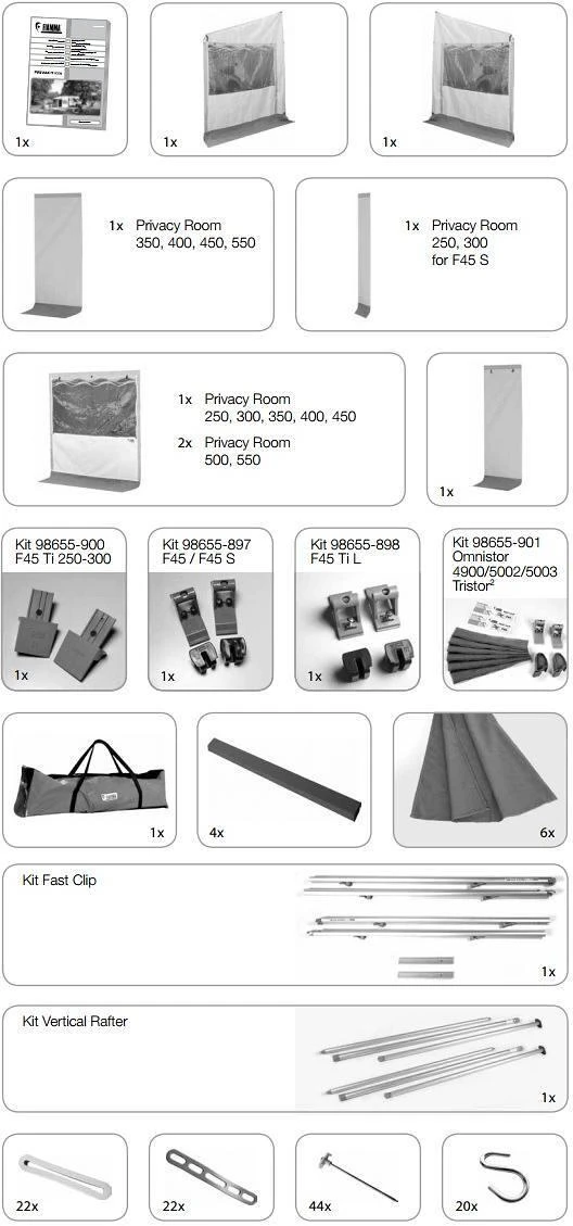Mit dem Privacy Room F45 verwandeln Sie Ihre Fiammastore in einen gemütlichen Wohnraum. Die Markise und die Seitenwände lassen sich rasch durch das patentierte Fast Clip verbinden. Das Markisentuch wird zwischen das untere und obere Profil geklemmt und durch Klemmverschlüsse im Inneren des Privacy Rooms geschlossen. Ein spezielles Polster befindet sich senkrecht im hinteren Teil der Seitenwände und wird durch eine Teleskopstange aus Aluminium angedrückt. Die Frontseite des Privacy Rooms wird in die Schiene der Frontblende eingezogen und durch Reißverschlüsse mit den Seitenwänden des Privacy Rooms verbunden. Die zwei Seitenfenster und das Frontfenster können geöffnet werden. Alle Elemente sind mit einem Moskitonetz und großen Klettverschlussstreifen für ein komplettes Schließen des Fensters ausgestattet.