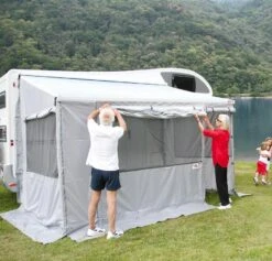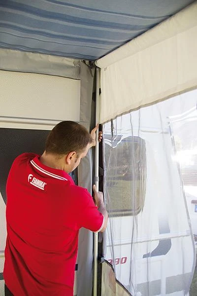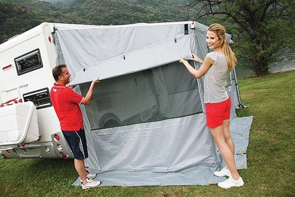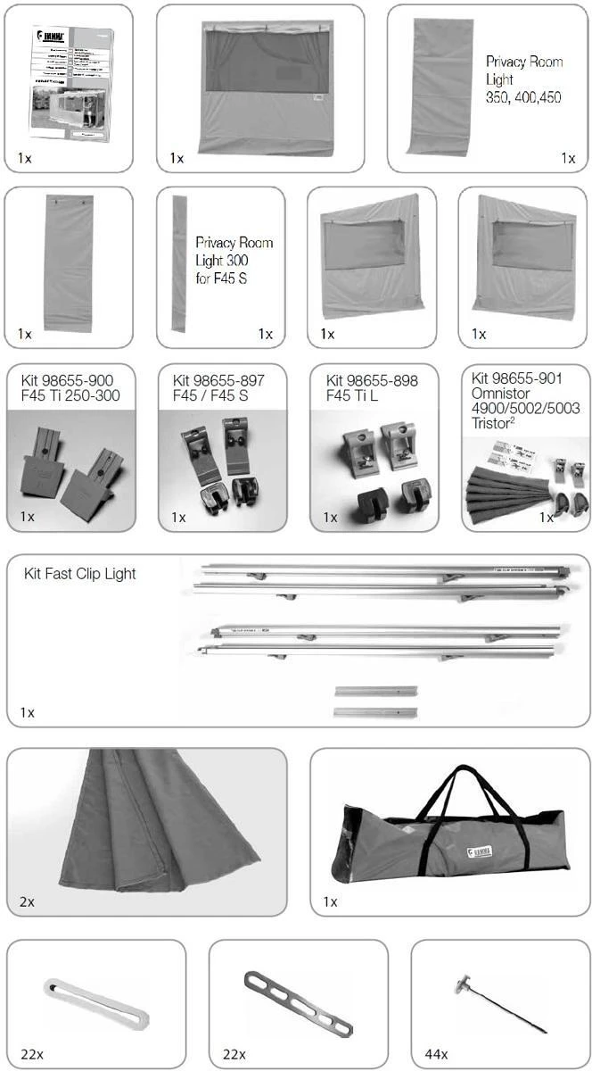 Serienmäßig mit Fast Clip Light System für ein schnelles und sicheres Anbringen am Markisentuch. Die beiden Fensterklappen dienen als Verdunklung, Fenster mit Moskitonetz. Das Frontteil wird in die Kederschiene der Frontblende eingezogen und mit den Reißverschlüssen der Seitenteile verbunden. Die Tür kann sowohl links als auch rechts angebracht werden. Die beiden Seitenwände haben an der Fahrzeugseite Gummizüge mit Haken,die oben und unten eingehängt werden können.