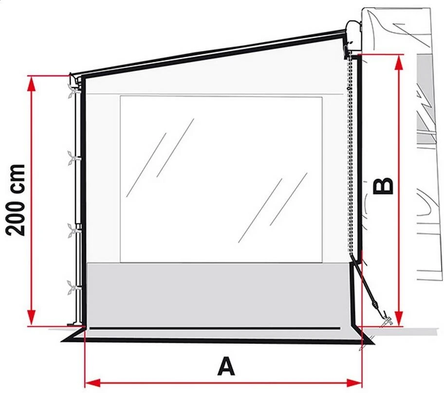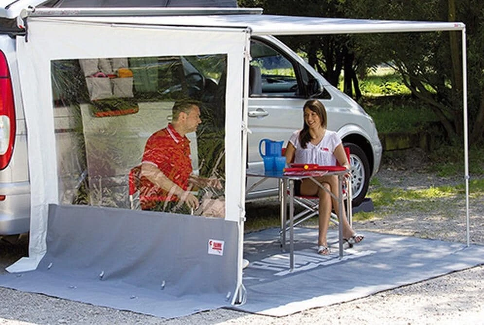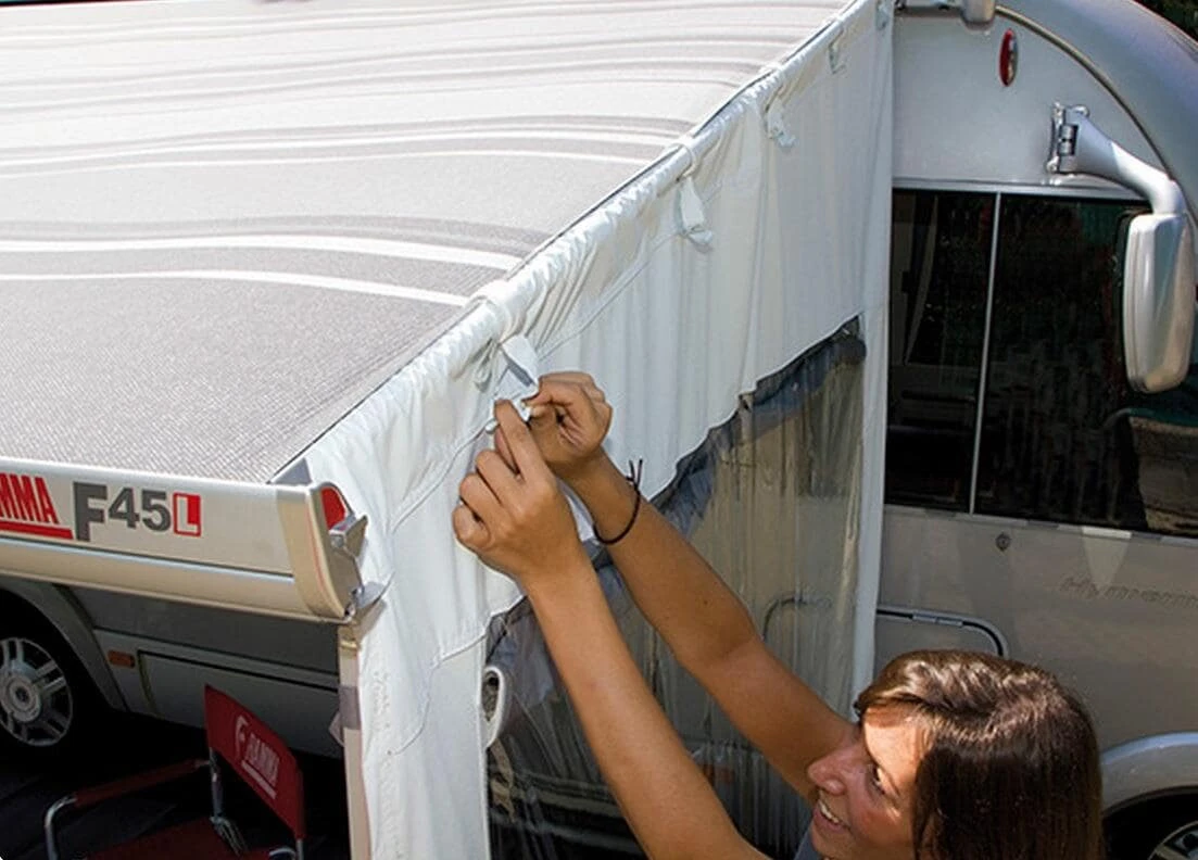 Einfache Montage durch die serienmäßig mitgelieferte teleskopische Spannstange aus Aluminium und elastischen Bändern. Die Verwendung ist ausgelegt in Verbindung mit der Markisen Fiamma Caravanstore und F35 Pro.