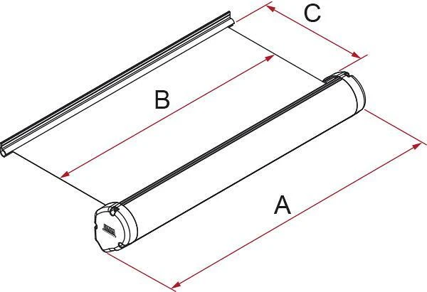 - Slide Out 280: Markisenbreite A (278 cm) – Tuchbreite B (272 cm) – Auszug C ( 100 cm) – 10 kg