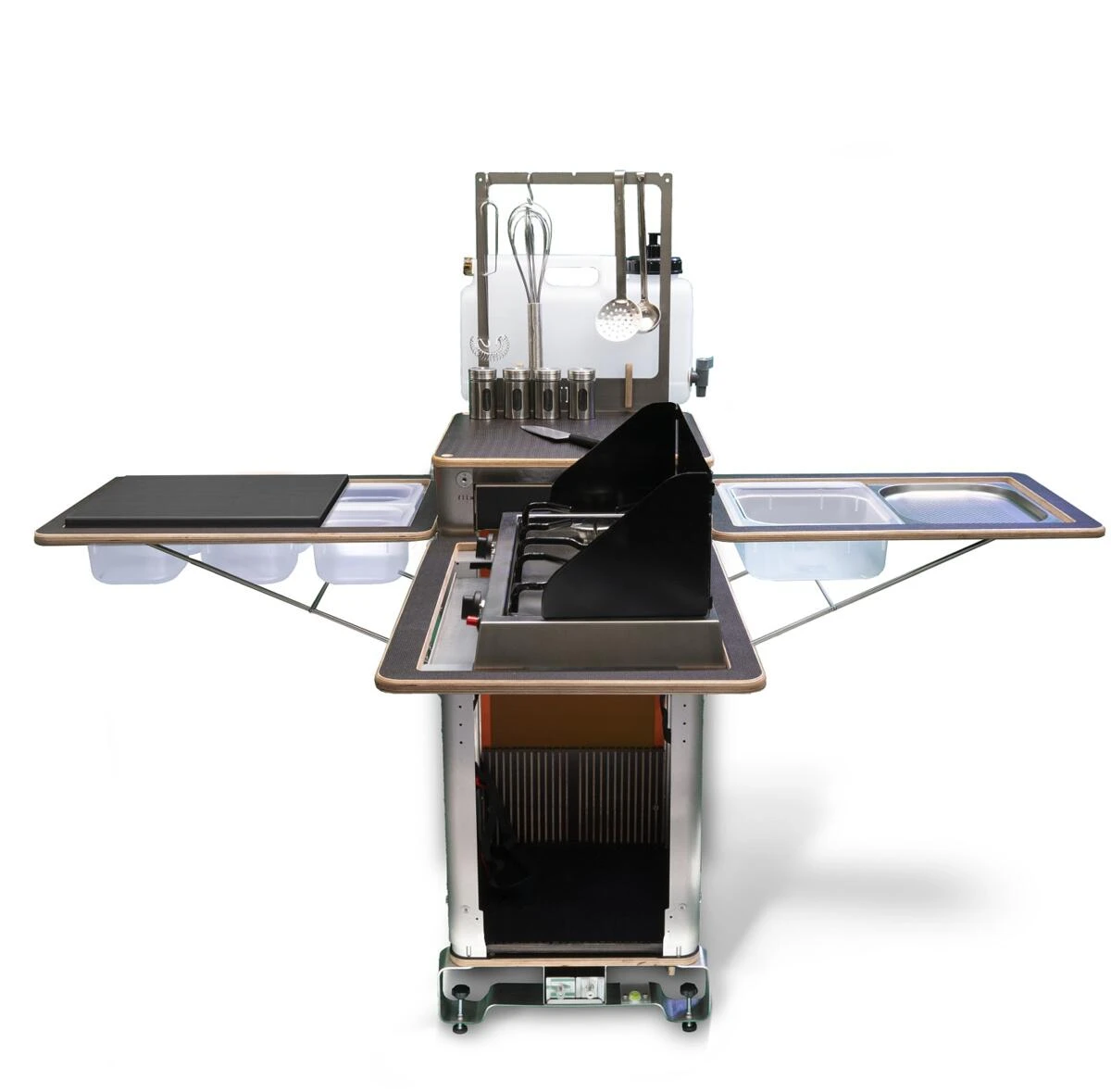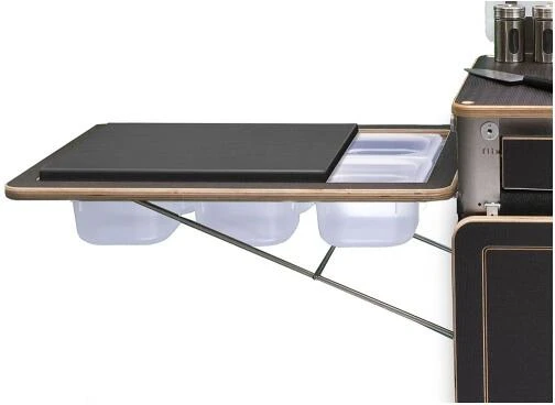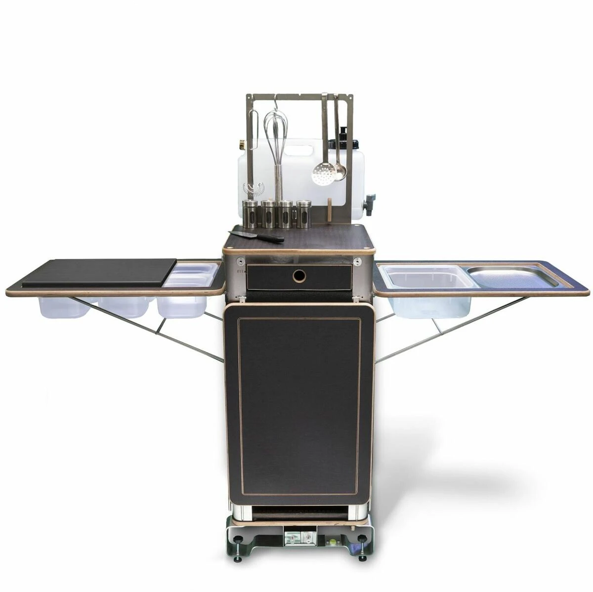 Elektrische Pumpe, Abwasserbehälter? Gibt es bei uns nicht – denn solche Teile sind wenig leistungsfähig, kompliziert und hygienisch problematisch. Bei uns gibt´s eher so richtig praktisch-clevere Dinge, wie zB den integrierten Seifenspender oder den flexibel feststellbarem Schlauch, Die Wasserstation können Sie an einer beliebigen Seite des Camper festmachen, auch die Ausrichtung des Auslaufs ist beliebig. Die komplette Station ist im Lieferumfang enthalten. Ein großes schwarzes Schneidebrett aus lebensmittelechtem Kunststoff gehört zur Grundausstattung des Live Camper. Sehr clever: Unter dem Schneidebrett werden 6 GastroNorm-Boxen eingehängt. Das Schneidgut wird direkt vom Brett in die Box geschoben – praktischer geht´s nicht. Auch zum Lagern der geschnittenen Zutaten optimal. Schneidebrett, Boxen & Deckel gehören zum Lieferumfang. Viele Campingplätze bieten eine Stromversorgung – Live Camper ist mit einer wassergeschützten Steckdosenleiste ausgestattet, so daß Sie mehrere Geräte betreiben können. Im Korpus von Live Camper findet die Grundausstattung leicht Platz – auch ein Herd, ein Grill oder eine Gasflasche können hier noch zusätzlich untergebracht werden. Extrem stabile Industrieklett-Bänder und flexible Zwischenwände sorgen für Ordnung und einen geräuscharmen Transport. Damit flix Camper auch bei einseitiger Belastung stets sicher steht, gibt es ganz unten 2 Zusatzgewichte.Wenn man die Küche fürs Ein- und Ausladen leichter machen möchte, nimmt man sie einfach heraus.