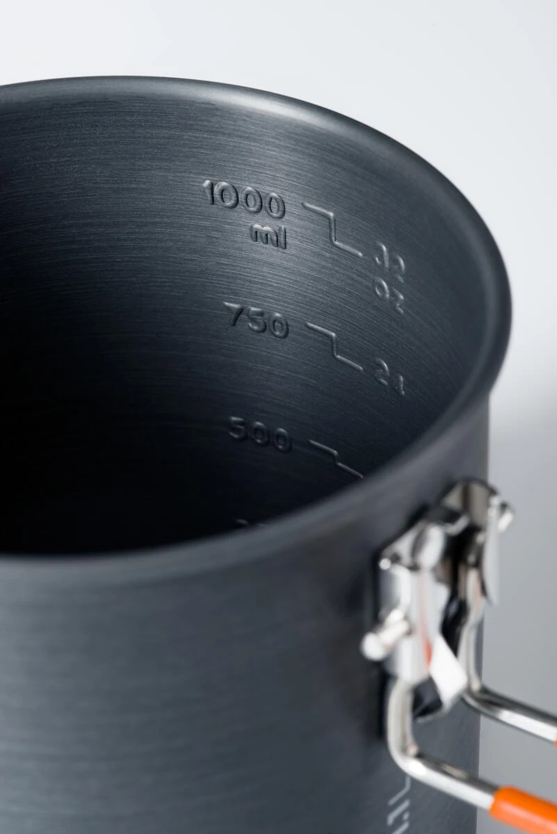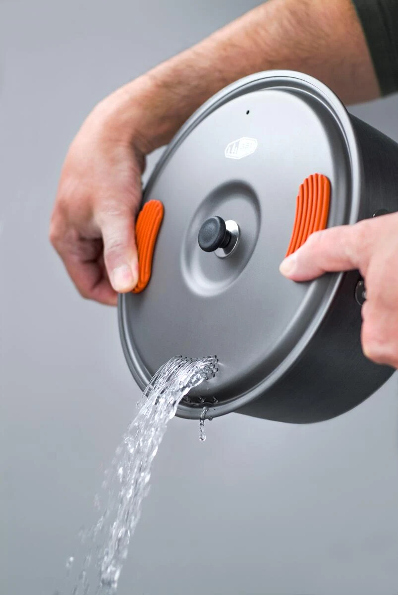 Hartanodisiertes Halulit-Aluminium bietet Titan eine überlegene Leitfähigkeit bei vergleichbarem Gewicht. Der 2-Liter-Topf kocht effizienter und ermöglicht es Ihnen, mit weniger Kraftstoff weiter zu gehen. Die integrierten Silikon-Daumenpolster am Deckel machen das Sieben von Nudeln sicher und zuverlässig.