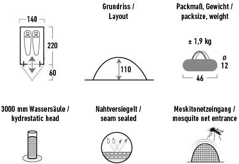 Das freistehende Leichtgewicht-Kuppelzelt mit hochwertigem Aluminiumgestänge wiegt nur 1,90 kg und besticht durch ein sehr kleines Packmass von 46 x 12 cm. Die Aluminiumgestänge 7001 T6 haben eine hochwertige Aluminiumlegierung mit einem Härtegrad von T6. Das stabile und flexible Gestänge gibt dem Zelt eine hohe Windstabilität. Die extra leichten und stabilen Aluminium Erdnägel verankern das Zelt sicher im Boden. Bei extrem harten Böden kann man mittels der großen Bodenschlaufen das Zelt mit Steinen befestigen. Das Außenzelt ist aus hochwertigem Polyester mit 3000 mm PU Beschichtung, nahtversiegelt und wasserdicht. Das Einfachdachzelt ist aufgrund seiner Konstruktion von einer Person schnell und mühelos aufzubauen. Die Apside bietet zusätzlichen Stauraum und die große Hochentlüftung sorgt für optimale Luftzirkulation. Der Eingang mit Moskitonetz bringt zusätzlich frische Luft ins Zelt und schützt vor Insekten. Das Zelt ist ausgestattet mit einer praktischen Netzablage und einem Lampenhalter. Das Kingfisher 2 LW bietet ausreichend Platz für 2 Personen mit Gepäck und ist bestens geeignet für Fahrrad-, Motorrad-, Kanu-Touren und Wildnis-Trekking-Camps.