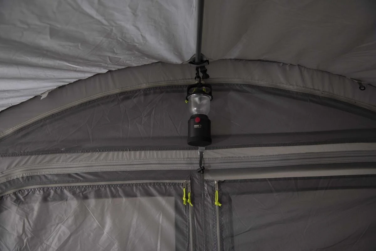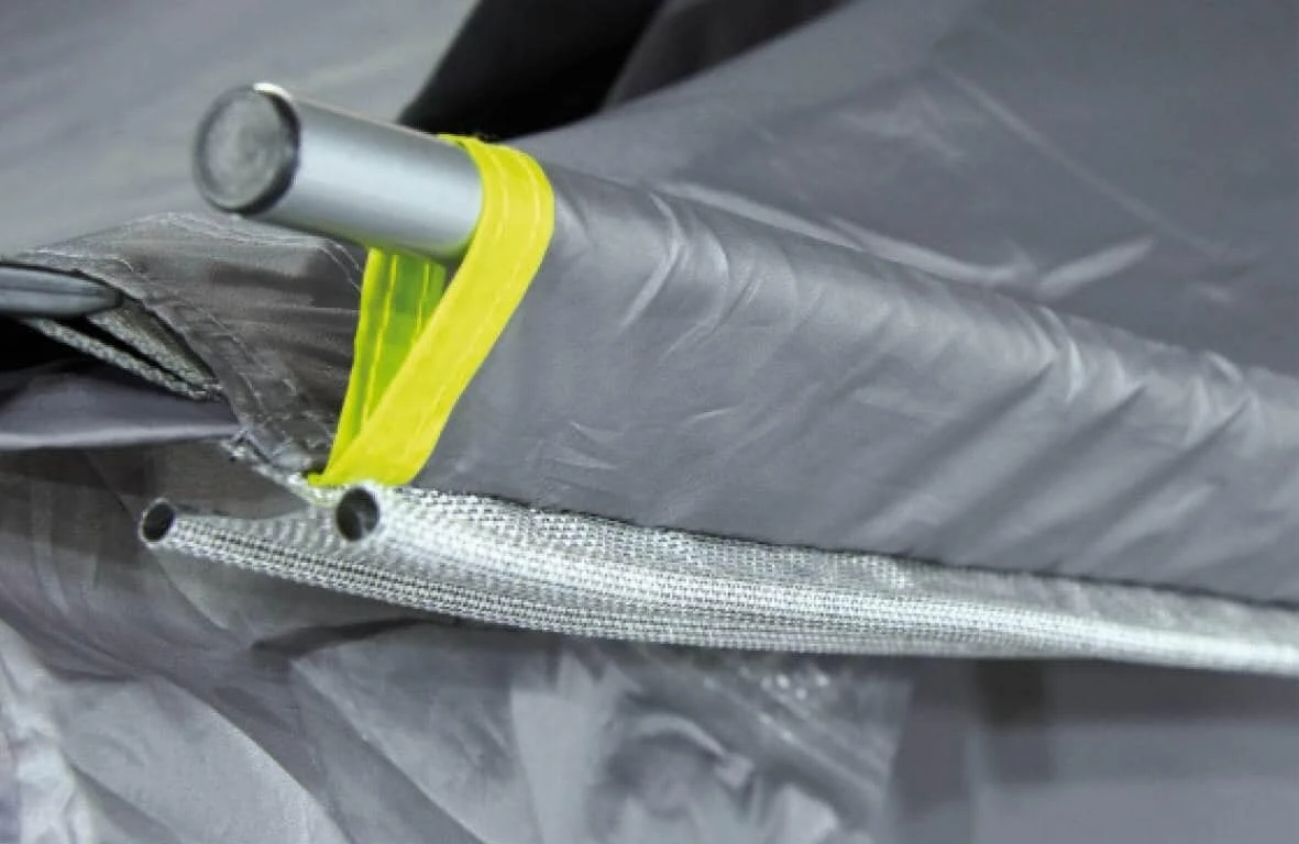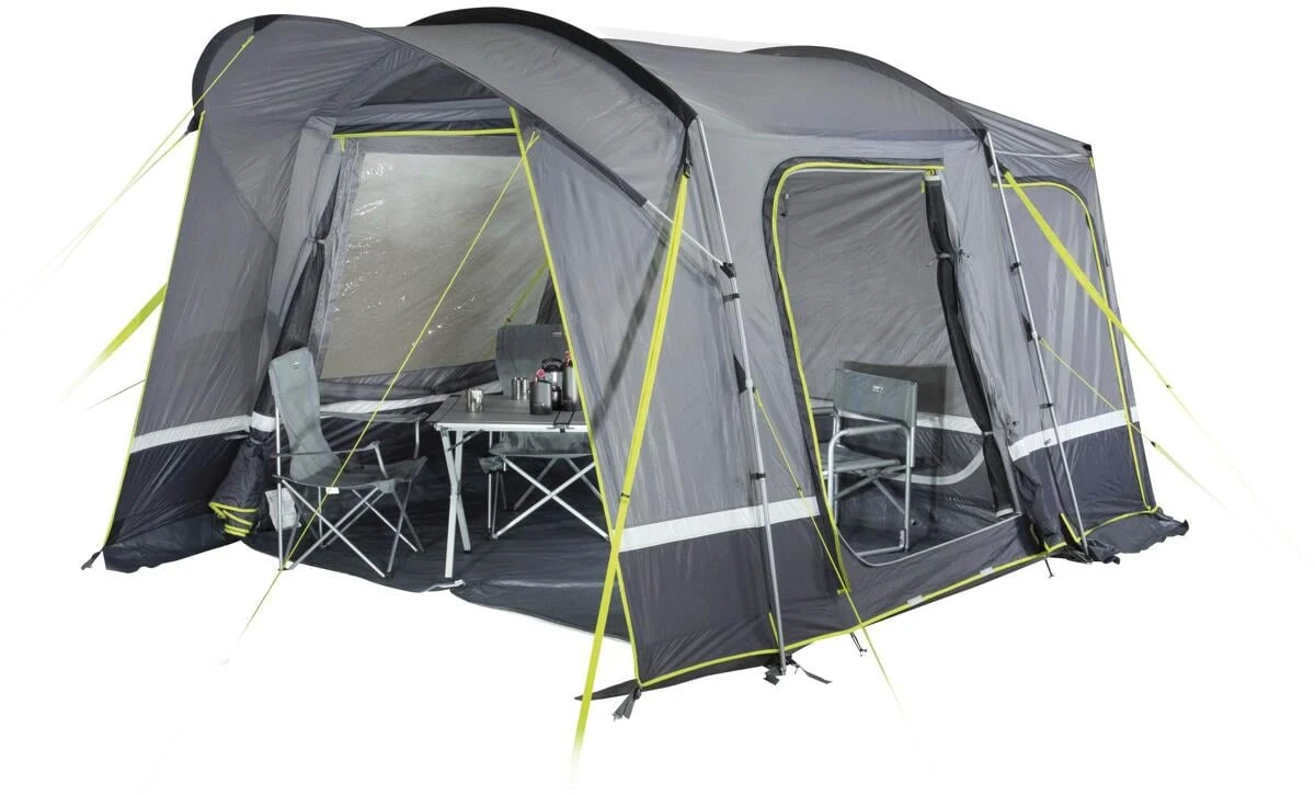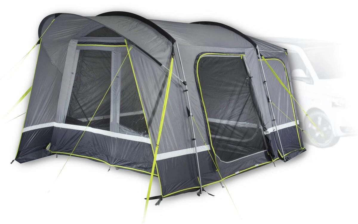Freistehendes „Drive Away“ Tunnel Busvorzelt in Steilwand-Konstruktion. Die rechten Seitenwände bieten ein optimales Raumgefühl. 3 Dachstützgestänge stabilisieren das Zelt. Das Vordach mit Wetterblenden schützt vor Wind, Regen und bietet Schatten. Der fest vernähte Boden mit dem Außenzelt verhindert das Eindringen von Schmutz, Nässe, Krabbeltieren und schützt vor Zugluft. Die Verandafront lässt sich je nach Wetterlage bis zur Mitte oder ganz öffnen. Die Bodenwanne kann an der Front herunter geklappt werden und verhindert Stolperfallen. Gazefenster aus extra starkem, reißfestem 150D „Superfine“ Moskitonetz belüftet den Wohnbereich und halten Insekten aus dem Zelt fern. Die innenliegende Reißverschluss Fensterklappe ist einfach zu bedienen und wird variabel als Dauerventilation eingesetzt. Gaze-Seitentür aus 150D „Superfine“ Moskitonetz für mehr Bewegungsfreiheit und Belüftung. 2 Klarsichtfolienfenster mit innenliegenden Reißverschluss- Fensterklappen können einfach und variabel bedient werden. Eine Hochentlüftung belüftet das Zelt an regnerischen Tagen.