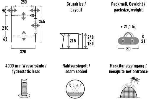 - Zeltboden: Polyethylen, 150D Polyester 120 gr² Super Strong Gaze