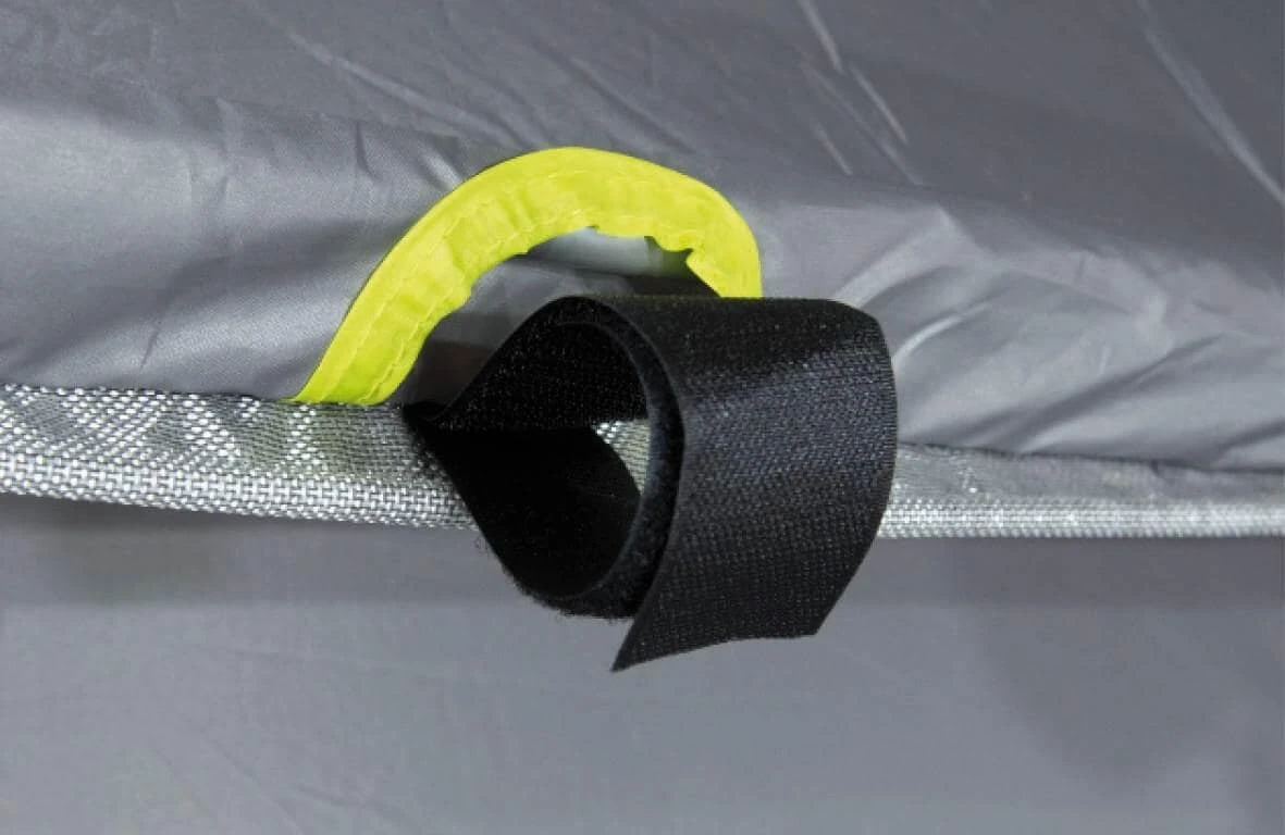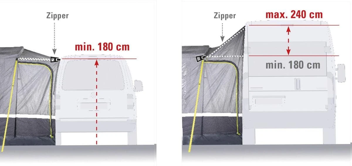 Verschließbare, 50/50 teilbare Rückwand. Die gesamte Rückwand passt in die Easy Stow Away Tasche und es entfällt das lästige Aufrollen. Extra robuste Reißverschlüsse mit Regen-Abdeckung gegen Feuchtigkeit. 4 Neon gelbe verstellbare Sturmbänder und Abspannleinen sind in der Dämmerung gut sichtbar. Kabeleingang mittels Reißverschluss und Kabelführung für Beleuchtung. Mit den Spanngurten kann das Buszelt schnell mit dem Fahrzeug verbunden werden.