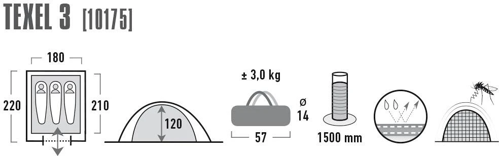 Das Texel ist der Evergreen schlechthin und gilt als tausendfach bewährte Urform des Kuppelzeltes. Das freistehende Doppeldach-Kuppelzelt mit wettergeschütztem Eingang ist ideal für Wochenend-Camping und Festivals. Die Nähte sind mittels Nahtband wasserdicht versiegelt und gewähren eine höhere Naht-Reißfestigkeit. Die Dauerventilation belüftet das Zelt auch bei regnerischem Wetter und sollte immer geöffnet werden. Innenzelt mit Moskitoeingang, Innentaschen und Lampenhalter. Das Texel 3 bietet Platz für 3 Personen oder 2 Personen mit ausreichendem Stauraum fürs Gepäck.