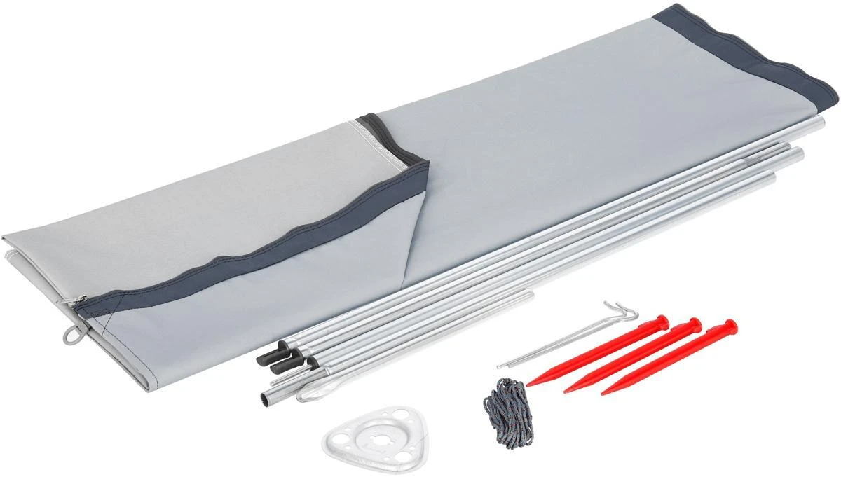 Stahlrohrgestänge (einschl. Querstangen), Spannleinen, Bodenanker und Heringe.