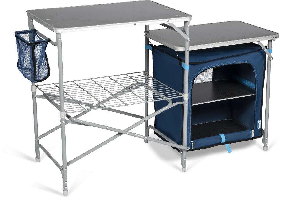 Hervorragender Stauraum und eine große Arbeitsfläche machen den Commander zu einer idealen Campingküche für größere Familien und längere Reisen. Der ausziehbare Seitentisch bietet zusätzlichen, geschlossenen Stauraum und eine weitere große Ablagefläche. Außerdem ist die Küche schnell und einfach abzubauen und kann aufgrund der geringen Packmaße und dem geringen Gewicht einfach verstaut werden.