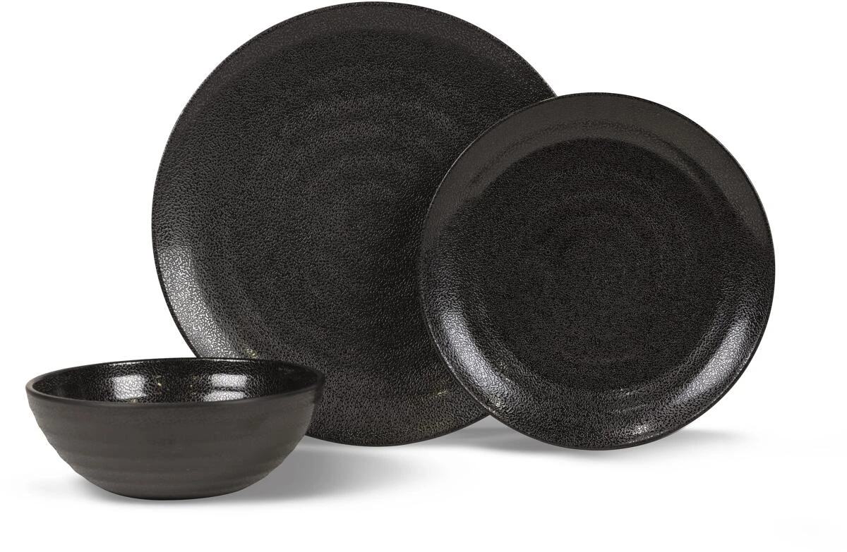 12-teiliges Geschirrset aus Melamin mit modernem Design. Das stabile und dennoch leichte Material eignet sich ideal für Campingurlaube oder Ausflüge.