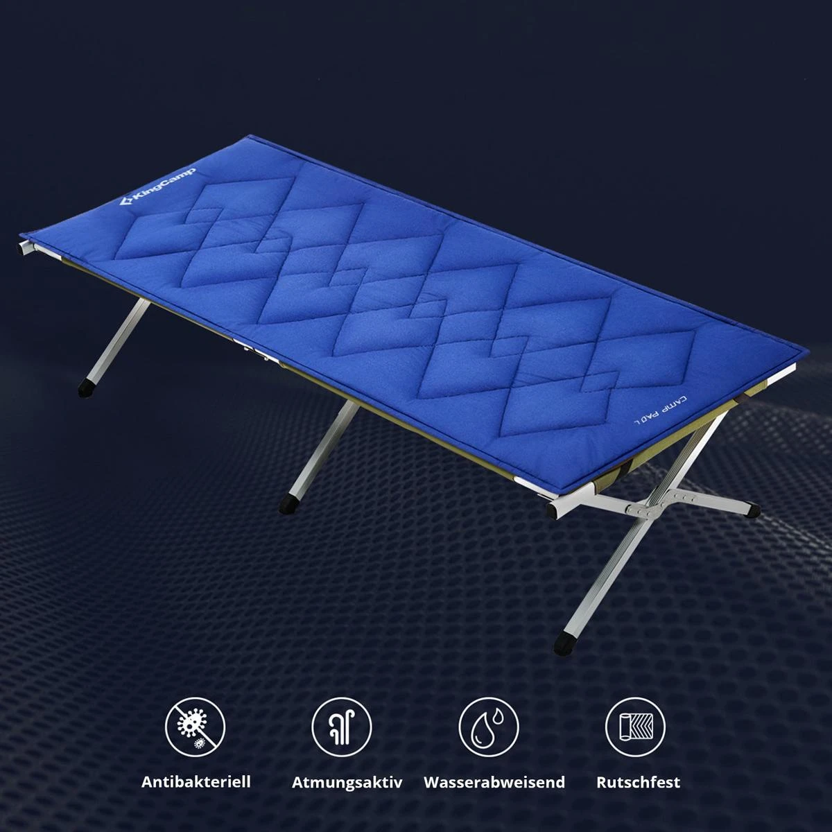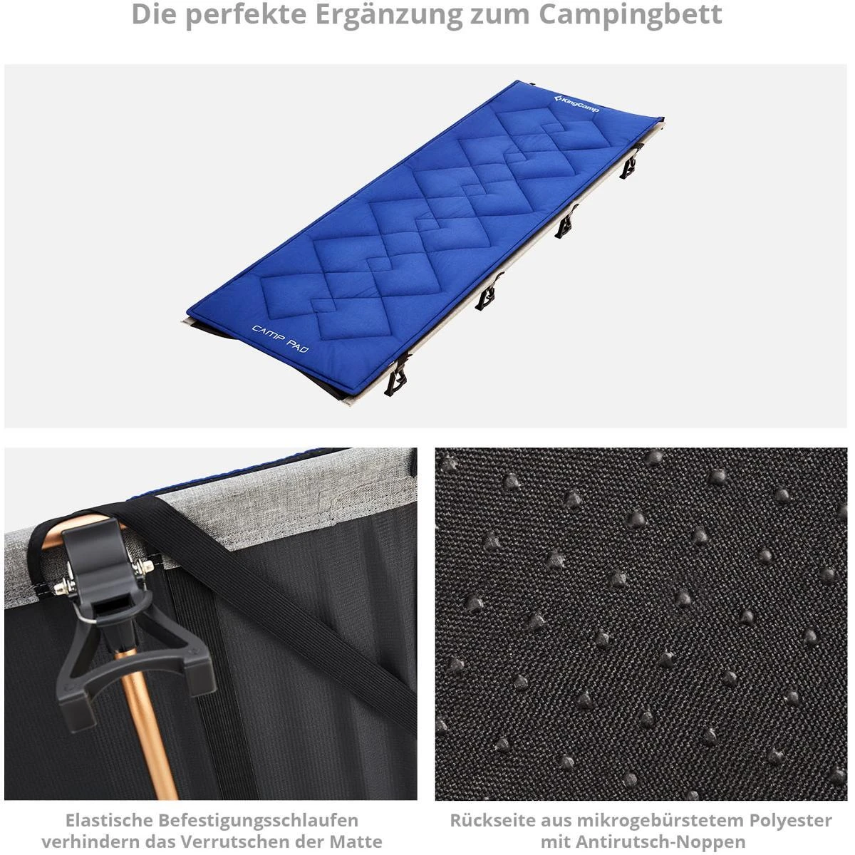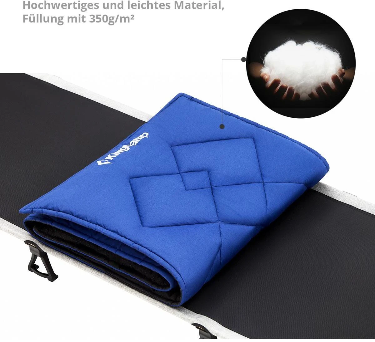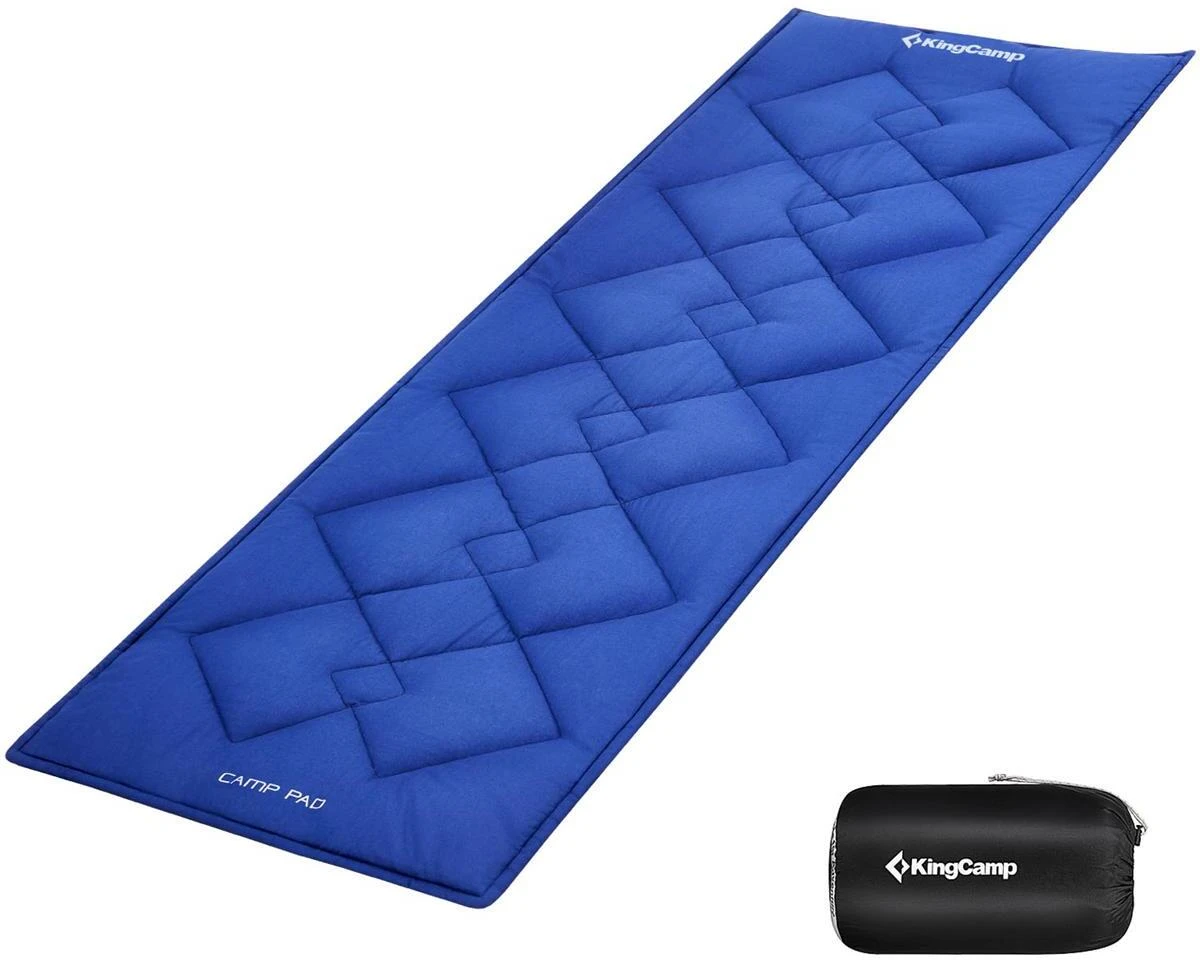 Wenn der Komfort eines erhöhten Feldbettes noch nicht ausreicht, dann können Sie Ihr Übernachtungserlebnis mit der Camp Pad Feldbett-Auflage von KingCamp noch luxuriöser gestalten. Die Auflagen haben ein erstaunlich geringes Gewicht und Packmaß bei einer komfortablen Breite und Länge. Das Obermaterial ist aus 100% Baumwolle und fühlt sich entsprechend sehr angenehm auf der Haut an. Die Füllung aus Polyester-Hohlfaser (350 g/m²) bietet optimale Isolierung für kältere Nächte. Besonders praktisch ist die rutschfeste Unterseite mit Anti-Slip-Noppen die ein Verrutschen der Auflage verhindert. Das Camp Pad ist universell bei vielen verschiedenen Feldbetten-Typen einsetzbar und wird unkompliziert mit 4 elastischen Bändern befestigt. Die Auflagen werden mit robustem Packsack aus 210D Oxford Polyester geliefert und sind in der Waschmaschine bei 30°C waschbar.