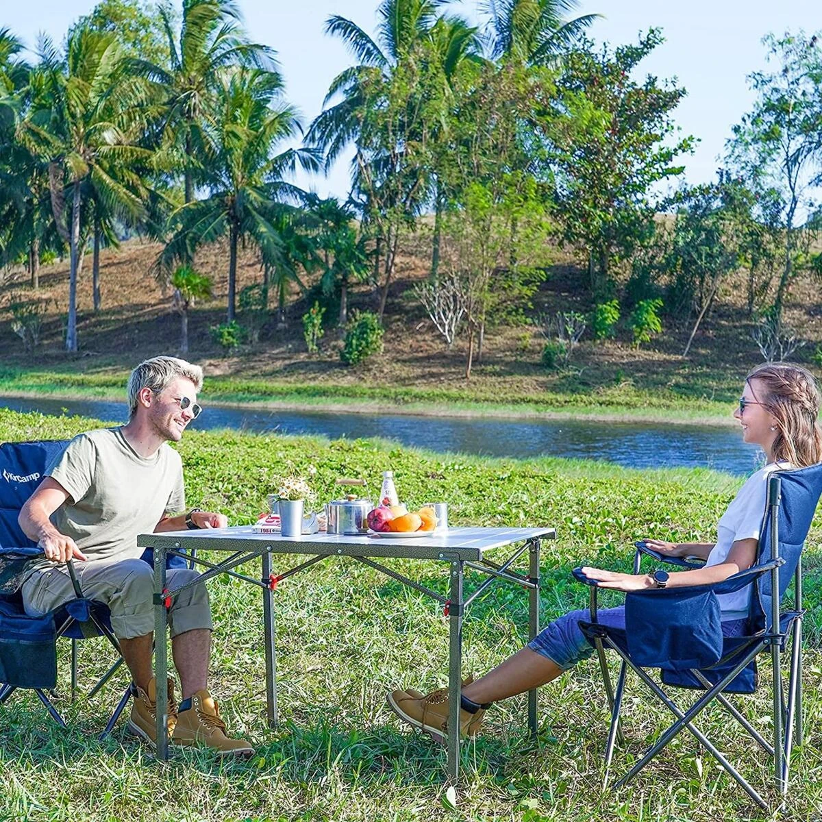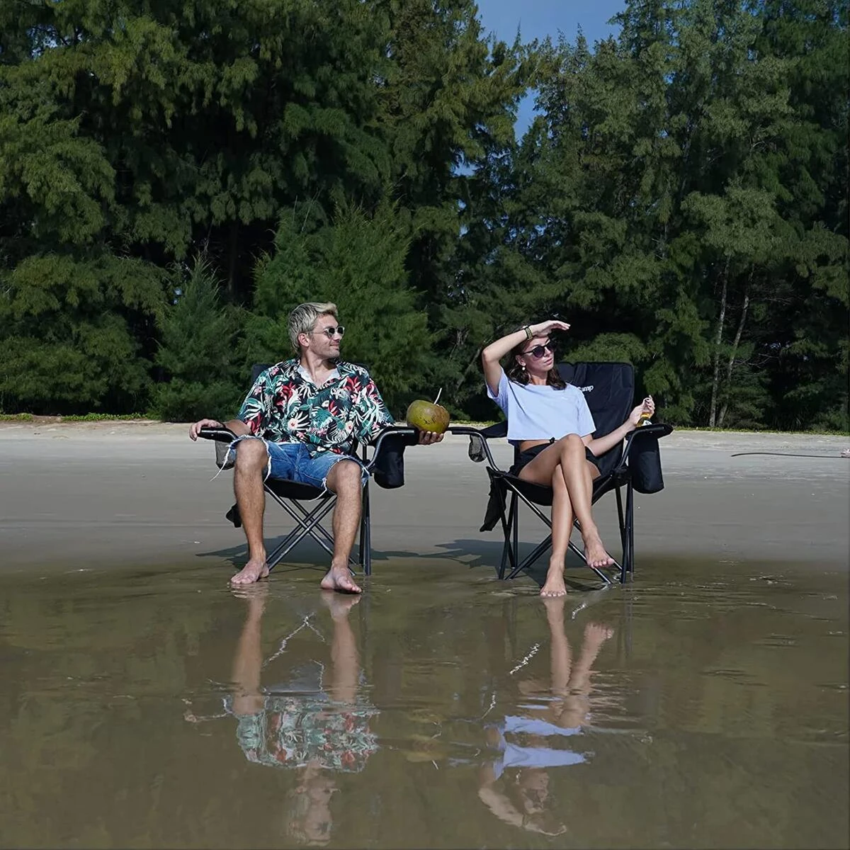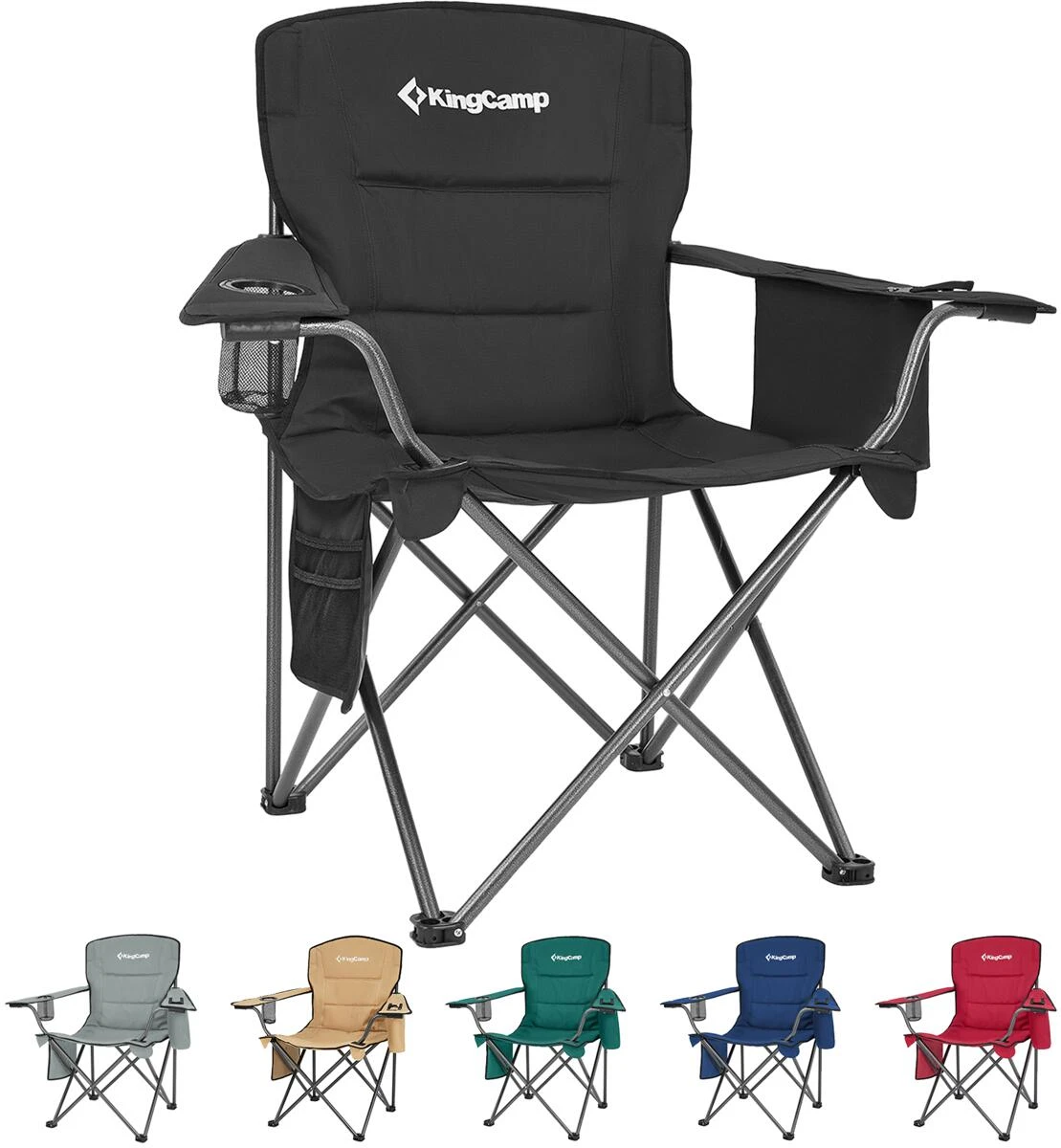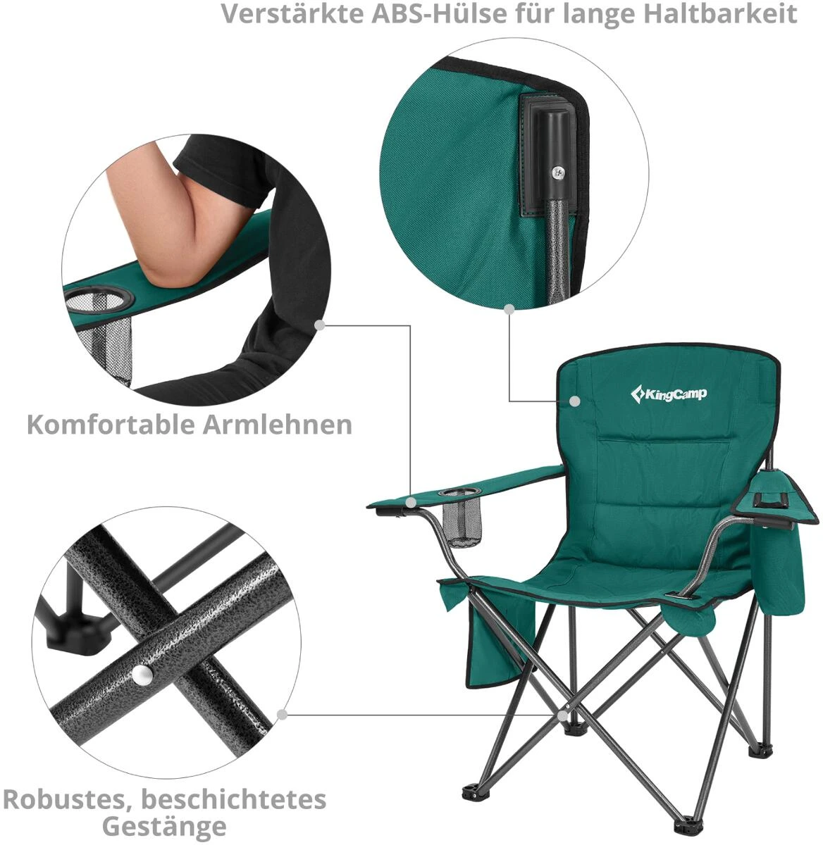 Mit dem Oakdale präsentiert KingCamp einen komfortablen Campingstuhl mit vielen durchdachten Extras für Campingplatz und Strand. Durch die großzügige Sitzfläche, das stabile Stahlgestänge mit robuster Hammerschlaglackierung und extra verstärkte Verbindungsteile ist der Stuhl bis zu 136 kg belastbar und somit auch für große Personen geeignet . Rückenlehne, Sitzfläche sowie die Armlehnen verfügen über eine Polsterung die zum hohen Sitzkomfort beiträgt. Der praktische Getränkehalter, die integrierte Kühltasche und eine große Tasche auf der rechten Seite, die Platz für Accessoires oder Smartphones bietet sind an Funktionalität kaum zu übertreffen. Dank der extra breiten Füße findet der Stuhl auch am Strand jederzeit festen Stand. Mit dem einfachen Klappmechanismus lässt sich der Stuhl schnell auf- und abbauen und in der großzügigen Tragetasche bequem transportieren.