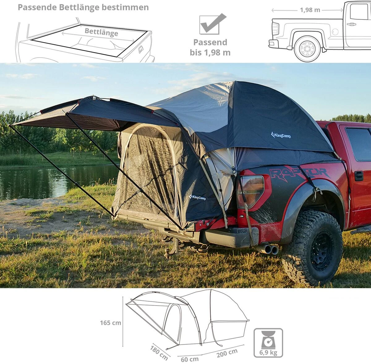 KIngCamps praktisches Pick Up Zelt verwandelt die Ladefläche eines Pick Ups in 15 Minuten in einen komfortablen Schlafplatz für zwei Personen. Das Innenzelt ist schnell aufgebaut, auf die Ladefläche gehoben und mit Gurten am Fahrzeug fixiert. Es kann bei gutem Wetter auch ohne das Außenzelt eigenständig genutzt werden, welches bei Bedarf mit Gurten über das Innenzelt gespannt wird. Das Außenzelt bietet mit 3000 mm Wassersäule auch bei stärkerem Regen zuverlässig Schutz. Die drei Meshfenster und die Meshtür des Zeltes sorgen für angenehme Belüftung im Zelt. Abgerundet wird dieses Zelt durch ein Sonnen- und Regenschutzdach am Zelteingang, praktische Organizer-Taschen und einer Laternenaufhängung.