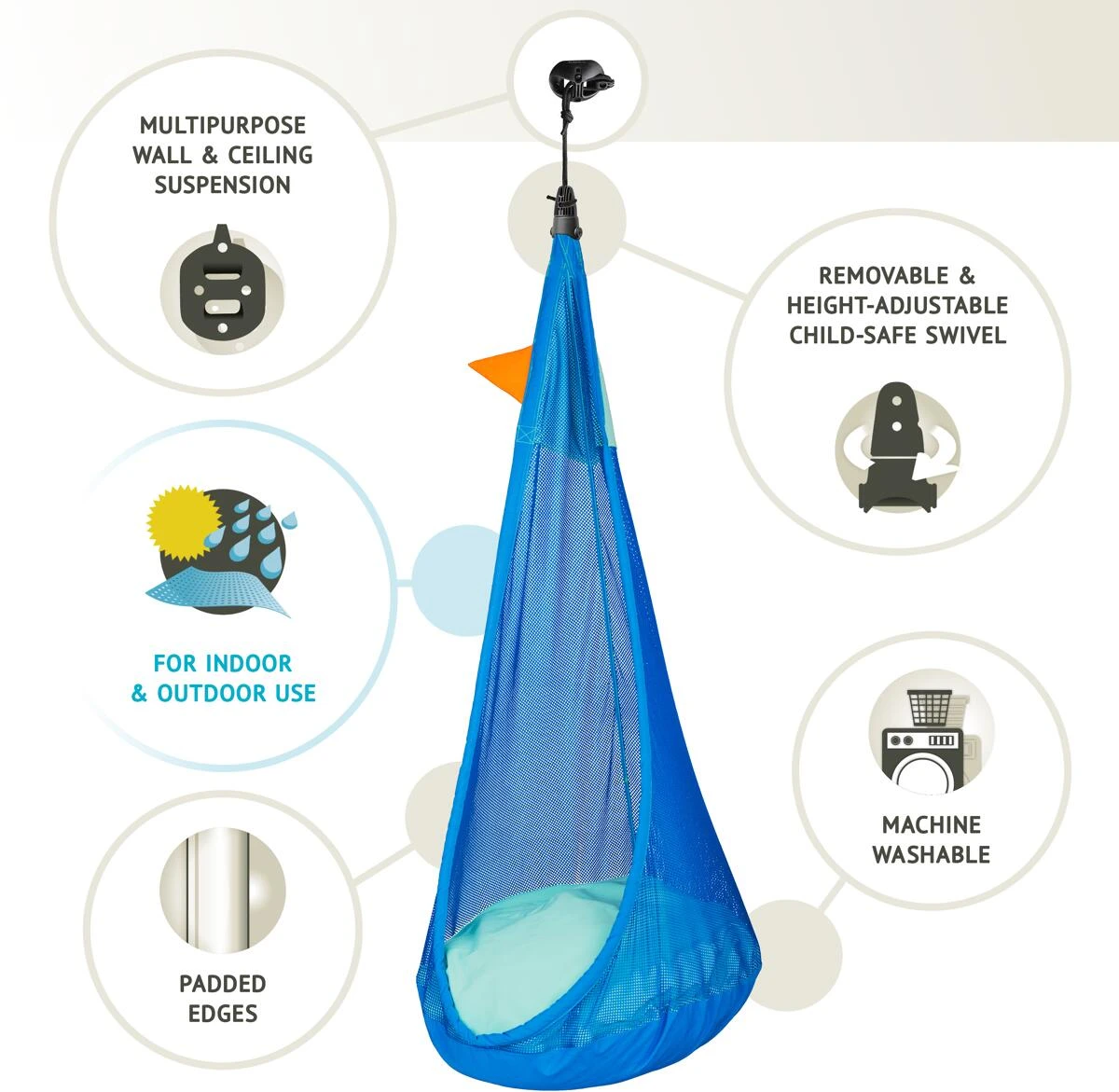 Ob im Kinderzimmer oder im Garten: Die extra große Kinder-Hängehöhle Joki Air besteht aus wetterbeständiger Outdoor-Faser und ist dank des Netzes angenehm luftig.