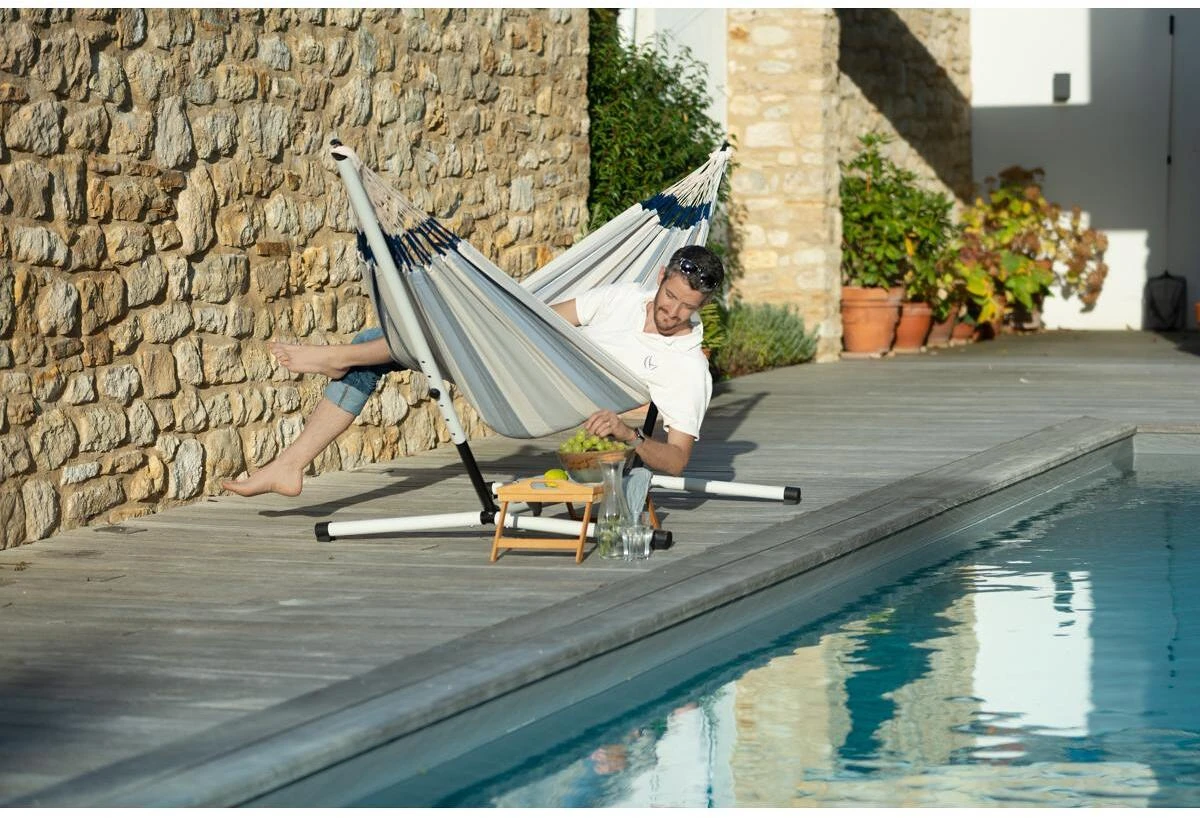 Des Nautico Hängemattengestell besteht aus pulverbeschichtetem Stahl und ist damit ideal für den Einsatz im Freien geeignet. Mit dem intuitiven PlugTube-System ist es blitzschnell auf- und wieder abgebaut.